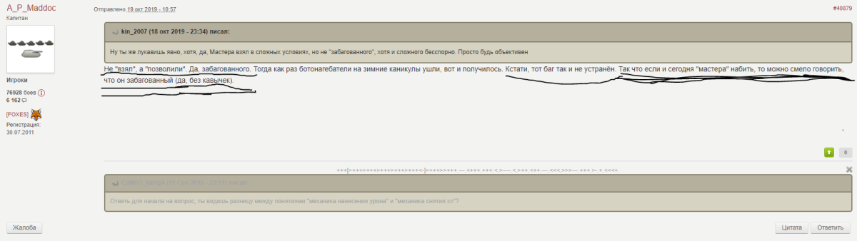 A_P_Maddoc Опубликовано: 24 апреля, 2024 Игроки 6 329 публикаций 86 477 боёв Жалоба Поделиться Опубликовано: 24 апреля, 2024 (изменено) 24 апр 2024 - 08:42 пользователь a_g_2 сказал: Интересные условия кстати. Мастер на 1 лвл против мастера на 10 лвл. А о патче идет речь это когда мастера на 1 лвл фактически нельзя было взять чтоль? Именно. Я тогда буквально на недельку себе аватарку слепил со значком мастера на МС-1 и надписью "я смог". Пчёлы на мёд так не летели, как хайлевельные папки со своим "фуписок ты дисятков ниасилил". Было весело. 24 апр 2024 - 11:58 пользователь CaM6O_IIaHgA сказал: 1. Где я брался в конкретном патче, непонятно!) Так ведь тот пост потёрли, а так бы... ну тыпонел.В очередной раз съехал вбок. А где ты брался именно забагованного набить? 24 апр 2024 - 11:45 пользователь CaM6O_IIaHgA сказал: Будет интересно, спроси у него где Мастер на СТ10? Я то свою часть выполнил и он это признал!))) Я не в курсе, что там тебе твои гномики в голову твою шепчут, но с чего ты решил, что у меня должен быть Мастер на СТ-10? Ты бы глазами читать начал, что ли...Кстати, ты не выполнил, и признал я именно это. Изменено 24 апреля, 2024 пользователем A_P_Maddoc +++[>+++>+++>+++>+++>+++<-]>+++>>+++.---.<+++.+++.<.>----.<.>++.<++.---.<<<.>>>---.+++.>-.+.<<<+. 11 Сен 2018 - 23:51 пользователь CaM6O_IIaHgA сказал: Ответь для начала на вопрос, ты видишь разницу между понятиями "механика нанесения урона" и "механика снятия хп"? Ссылка на комментарий Поделиться на других сайтах Другие способы поделиться...