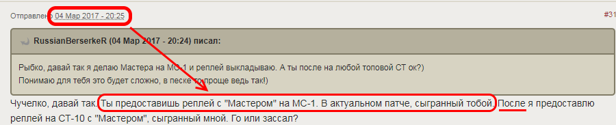 CaM6O_IIaHgA Опубликовано: 24 апреля, 2024 Игроки 6 808 публикаций 73 701 бой Жалоба Поделиться Опубликовано: 24 апреля, 2024 24 апр 2024 - 09:42 пользователь a_g_2 сказал: Интересные условия кстати. Мастер на 1 лвл против мастера на 10 лвл. А о патче идет речь это когда мастера на 1 лвл фактически нельзя было взять чтоль? А теперь хочешь посмеяться?) Это же файлик Маддока, так?)А вот ответы Маддока!)10 мар 2018 - 13:29 пользователь A_P_Maddoc сказал: 08 Мар 2018 - 14:15 пользователь RussianBerserkeR сказал: 5. Ну как обычно, слился, ожидаемо Маддок, ожидаемо!) Я вот забагованного Мастера взял, а ты с задачи обычного Мастера взять сливаешься и заметь, я даже тебе не ставлю задачку на конкретной машине это сделать!) 5. Ну взял, ну молодец, возьми с полки пирожок. Балаболко*5, а откуда у меня вдруг взялась задача про какого-то мастера? Ты завязывай употреблять то, что ты там употребляешь и слушать шёпот белочек (или зелёных гномиков, кто там тебя разберёт). 19 окт 2019 - 10:57 пользователь A_P_Maddoc сказал: Не "взял", а "позволили". Да, забагованного. Тогда как раз ботонагебатели на зимние каникулы ушли, вот и получилось. Кстати, тот баг так и не устранён. Так что если и сегодня "мастера" набить, то можно смело говорить, что он забагованный (да, без кавычек). То есть очкотрёп признаёт факт взятия забагованного Мастера, после чего переобувается и сливается со взятия Мастера на СТ10!))) А сейчас опять переобувается!Будет интересно, спроси у него где Мастер на СТ10? Я то свою часть выполнил и он это признал!))) Самые бесполезные даты в истории: 11.02.1145 \ 13.05.1418 \ 03.07.1743 \ 27.10.1971... Ссылка на комментарий Поделиться на других сайтах Другие способы поделиться...