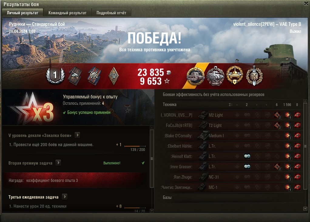 The_X_Factor Опубликовано: 27 апреля, 2024 Игроки 8 741 публикация 30 556 боёв Жалоба Поделиться Опубликовано: 27 апреля, 2024 26 апр 2024 - 04:38 пользователь violent_silence сказал: Путем нечеловеческих усилий победил взвод коварных пулеметчиков. Ну и заодно повесил на грудь юбилейный орден. Стремлюсь к лаврам Леонида Ильича! о мне как раз на этом китайском хламе мастера брать надо будет. Боюсь. こんにちは皆さん!お元気ですか? Ссылка на комментарий Поделиться на других сайтах Другие способы поделиться...