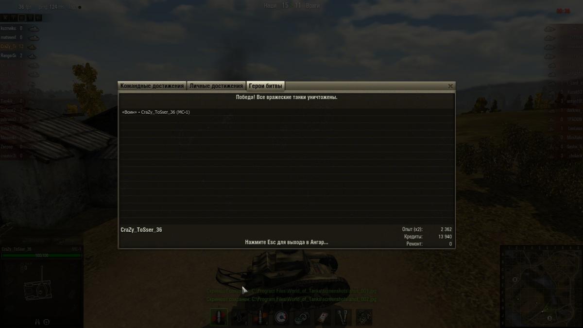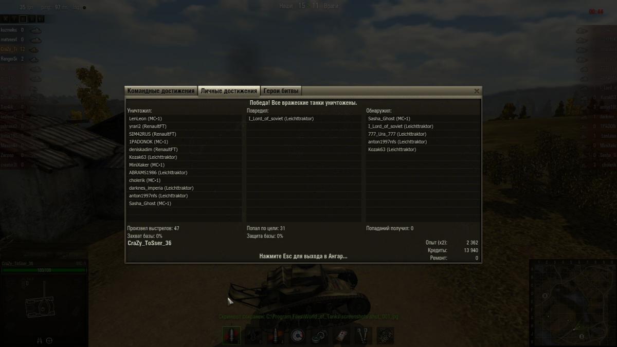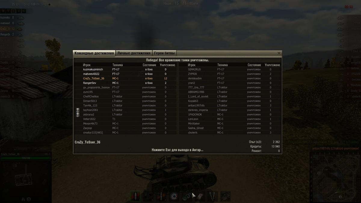 CraZy_ToSser_36rus Опубликовано: 3 июня, 2012 Игроки 36 публикаций 18 006 боёв Поделиться Опубликовано: 3 июня, 2012 Похвалюсь утренним боем. Обновил свой рекорд для МС-1. Малиновка, 2 респ, позиция куст слева на краю поля. Народ пер и по флангам и с тыла, башней крутил как угорелый. Наверное еще не проснулись и лезли как очумелые, хотя и в нашей команде половина уже слилась на 3-й минуте боя. 3 Ссылка на комментарий Поделиться на других сайтах Другие способы поделиться...