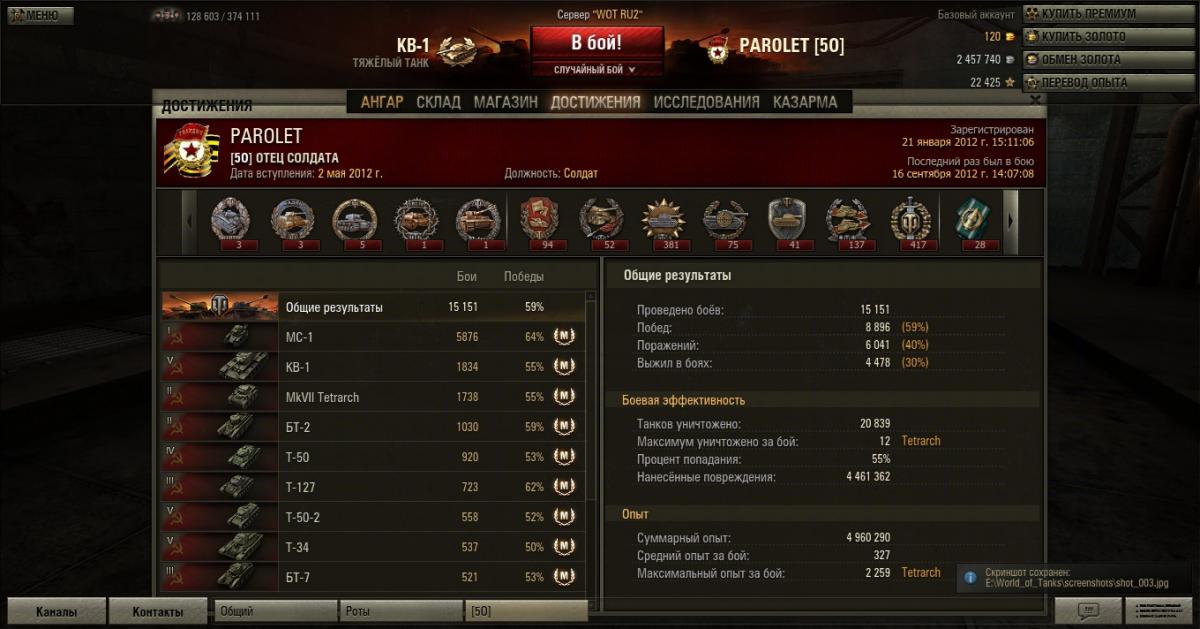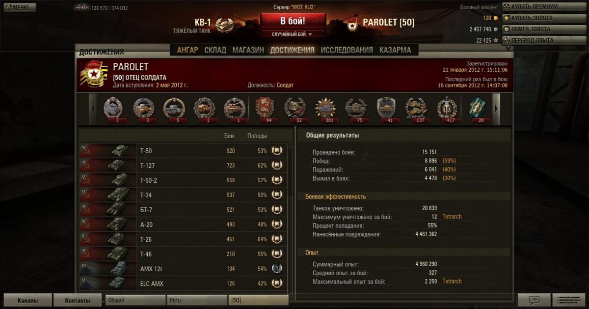 PAROLET Опубликовано: 16 сентября, 2012 Игроки 8 400 публикаций 207 978 боёв Поделиться Опубликовано: 16 сентября, 2012 (изменено) 16 Сен 2012 - 10:33 пользователь Bl4ck сказал:откуда столько денег,если нету прем-танков?! рассказывай,а то у меня и ПА и Т34 есть,а все равно сейчас лишь 900кПривет!В принципе у меня есть два прем. танка: Тетрис и Т-127. Но серебро по большому счёту копится со всех моих танков (14 шт.). За вечер могу набрать от 200 000 до 250 000. Прежде всего величина серебра зависит от результативности танка в бою. Ни на одном своём танке в минус не ухожу. Почему у Вас мало серебра я не знаю. Изменено 16 сентября, 2012 пользователем PAROLET Aut cum scuto, aut in scuto! Ссылка на комментарий Поделиться на других сайтах Другие способы поделиться...