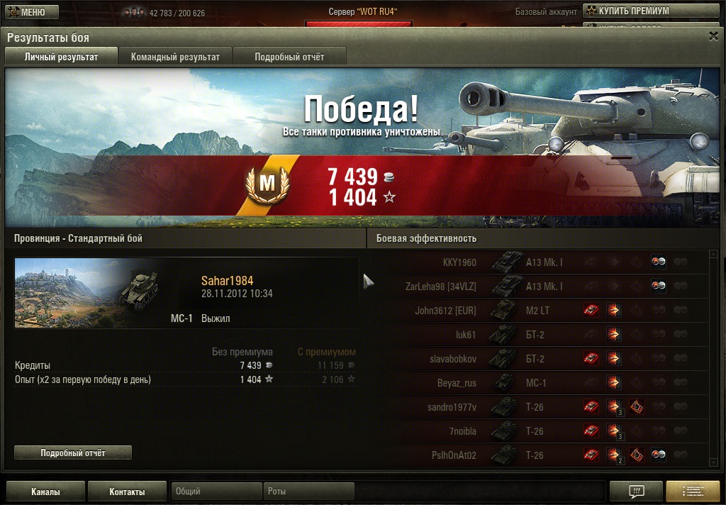 Sahar1984 Опубликовано: 28 ноября, 2012 Игроки 75 публикаций 58 593 боя Поделиться Опубликовано: 28 ноября, 2012 цель достигнута - взял мастера. с танком мы будем прощаться. не потому что он плохой, а просто в игре еще столько интересных машин. танк отличный. в этой игре был со вторыми уровнями в самом низу - напару Т1, но он проспал всю игру. и тем не менее МС-1тащил (правда на пару с МК II). есть у меня на нем и воин и камикадзе. очень понравился. может и вернусь к нему когда-нибудь с большим удовольствием. дальше буду Т1 в песочнице катать. загрузил скрины, а видео не знаю как в подходящий формат переделать. Ссылка на комментарий Поделиться на других сайтах Другие способы поделиться...