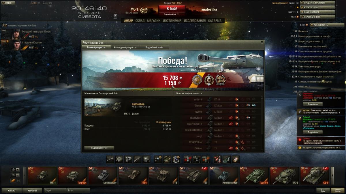 FantomFire Опубликовано: 6 января, 2013 Игроки 437 публикаций 14 306 боёв Поделиться Опубликовано: 6 января, 2013 А я все пропустил. Успею только расходники закупить да опыт за медали пособирать. У меня 47%!!! Почему мне так не везет с командой? Ссылка на комментарий