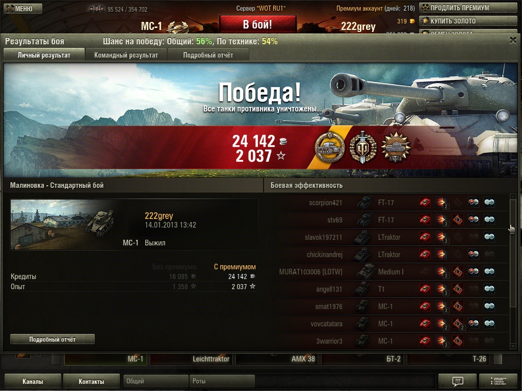 P469MT Опубликовано: 14 января, 2013 Игроки 119 публикаций 23 093 боя Поделиться Опубликовано: 14 января, 2013 13 Янв 2013 - 16:14 пользователь Bikicer сказал:1. За почти 300 боёв на МС1 - это впервые.2. Что-то не припоминаю, чтобы меня ваншотили на других танках (арта не в счёт).это наверно я тебя заваншотил))вчера один МС-1 на своей базе в кустах у домиков (малиновка) словил от меня -100 крит в боеукладку, метров с двухсот "У России нет друзей, а есть только два верных союзника - ее армия и флот" (Александр III)«Война – это не кто кого перестреляет, а кто кого передумает!» старшина Васьков, «А зори здесь тихие...»http://armored-foxes.clan.su Ссылка на комментарий Поделиться на других сайтах Другие способы поделиться...