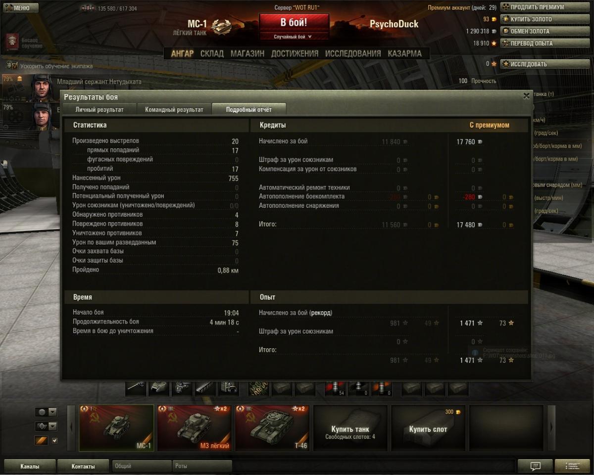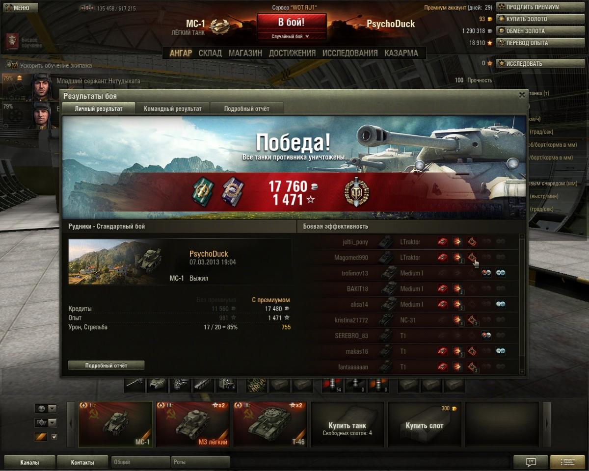 RenamedUser_12848034 Опубликовано: 7 марта, 2013 Игроки 715 публикаций 3 053 боя Поделиться Опубликовано: 7 марта, 2013 07 Мар 2013 - 17:18 пользователь val_210 сказал:Привет,vonRoh ! :)Но играешь ты на тракторе.Привет)Потому что жду лео 1 и качаю под него экипаж) уже 4 перка выкачал за почти 1000 боев.Ты не скажи пожалуйста. Как ты вчера так слился? Я и не понял даже, пока пц 35т разобрал, тебя уже нет((((. А на т26 мне не хватило 2 секунд, время подло закончилось. Но затем был бой еще хуже: меня жестоко наказалыыыы!!!! Бой рудники. Забрал 10 фрагов. Осталось 1 мося. Стала на базе в кустах. А я в погоне за кпд ехал по короткой дороге и в итоге лампа горит и я горю)))). Оставил ей 20 хп. Но команда аленей в 6-м не смогла в ее ни разу попасть. В итоге у мс1 колобок и мастер 8 фрагов, а чел играл 3 бой. Разве это не читеркий танк???? Ссылка на комментарий Поделиться на других сайтах Другие способы поделиться...