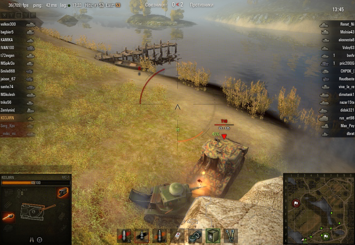 grig54 Опубликовано: 17 марта, 2013 Игроки 6 228 публикаций 49 354 боя Поделиться Опубликовано: 17 марта, 2013 (изменено) 17 Мар 2013 - 15:54 пользователь Great_Helmsman сказал:Это смотря куда попал. Можно попасть в ствол, вроде бы попал, но сплеш учитывается с места попадания, соответственно до самого танка дойдет фиг да нифига. Второй вариант - тупо промазал. Да, МС задело сплешем, сминусовало ХП. Хотя в данном случае ты должен услышать (как артоводы) "Накрыло" или "есть накрытие".Попал в бок или зад.По фото видно.Чего услышал не помню честно.Я по нему два раза стрелял.В упор.Первый раз попал в канень.Как *** знает прицел на нем был даже дождался сведения. ВБР однако.Второй в него.Он задом ко мне стоял даже башню нав развернуть не успел.Стрелял по мне другой он на фото есть. Изменено 17 марта, 2013 пользователем grig54 −−−• − −−− −• •− −−−− •− •••− •• −−•• −• −••− ••−−•• •• −−• •−• •− Фортуна любит смелых, а ВБР красных. ВЕРНИТЕ ПРОВИНЦИЮ-положите туда откуда взяли!!! Враг хитер и коварен. Огонь Провел на курортах Банландии 190 дней Ссылка на комментарий Поделиться на других сайтах Другие способы поделиться...