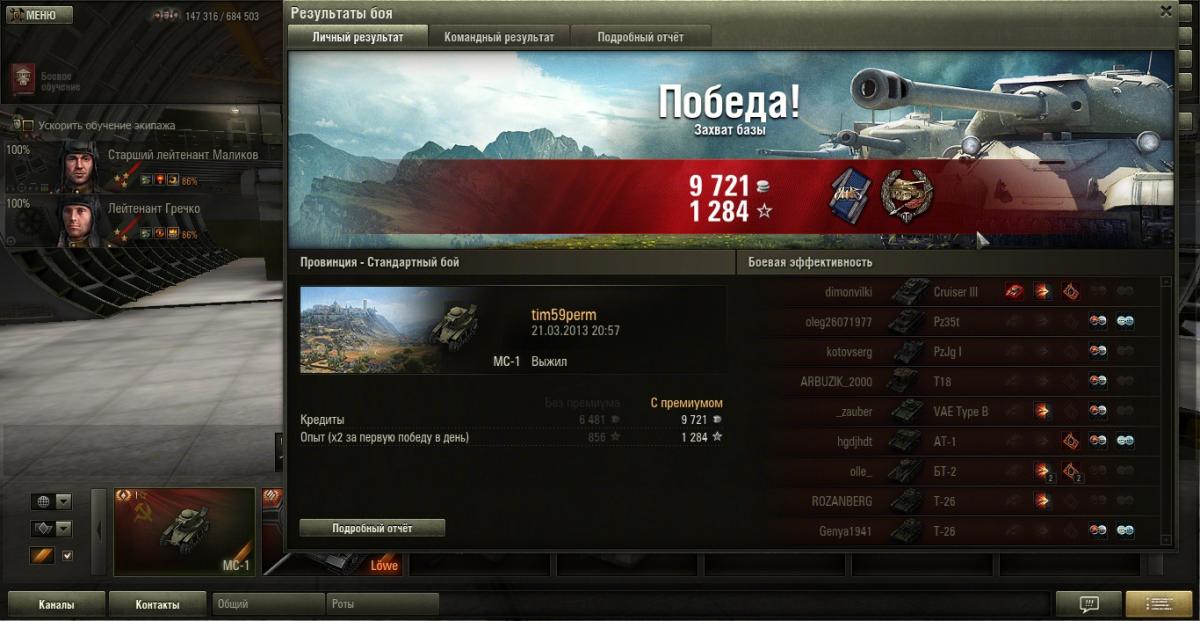 Adaequatus Опубликовано: 21 марта, 2013 Игроки 64 публикации 6 464 боя Поделиться Опубликовано: 21 марта, 2013 Вот я и наездил 1000 боев, такой вот я задрот , второй перк 89%, однако вряд ли докачаю. Боевая эффективность на этом танке сильно превосходит мои успехи на других. Захотелось погонять на 2 уровне (уже наверно пора), выбрал ПЗ2 и Т18, пока экипаж не 100%, не очень доставляет. Но уже побил свой рекорд по фрагам, на Мосе - 10, на Т18 - 11. А так, в планах, докачаться до АТ2, наверно за пару месяцев дойду до него. Ссылка на комментарий Поделиться на других сайтах Другие способы поделиться...