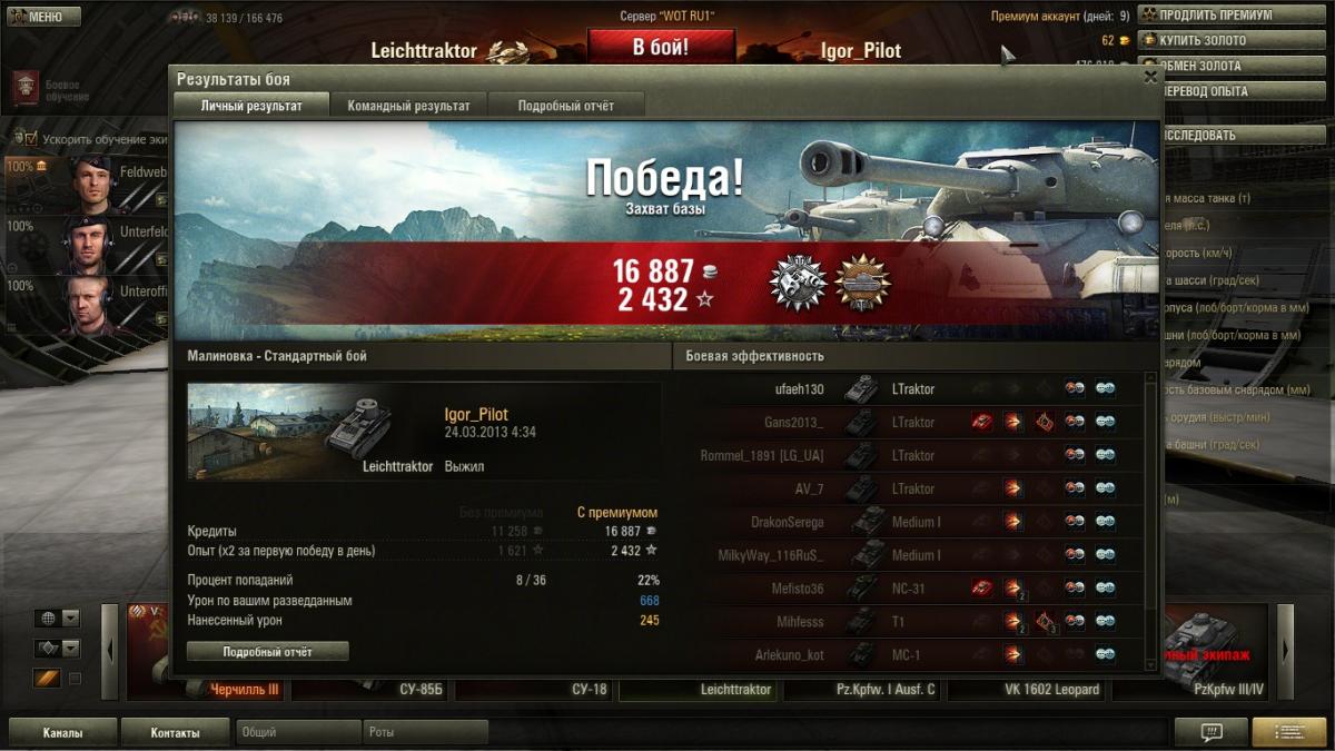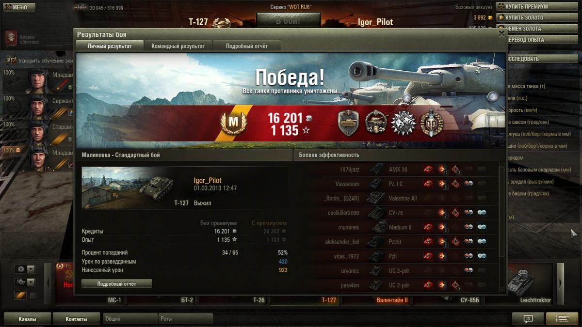 Igor_Pilot Опубликовано: 20 апреля, 2013 Игроки 571 публикация 34 702 боя Поделиться Опубликовано: 20 апреля, 2013 20 Апр 2013 - 08:59 пользователь A_P_Maddoc сказал:По паспорту у АМХ40 максимальная скорость 50 км/ч. Надеюсь, видели этого шустрика?Видели. http://cdn-frm-eu.wargaming.net/wot/ru/uploads/monthly_04_2013/post-11869927-0-27938400-1366450014_thumb.jpgИ даже 72 км/ч видели, но скрина нет. 20 Апр 2013 - 09:46 пользователь grig54 сказал:Пересадил экипаж на Т-60, обучил, повоевал.Пересадил обратно требуется теперь переобучение на МС-1.Пишет что все всё забыли и навыки не работают.Интересное решение.Абсолютно забывчивый экипаж. Или я что-то не так сделал?Шторм ответил что так и задумано.Так и задумано. Вы что, никогда никого никуда не пересаживали/переучивали до этого? 20 Апр 2013 - 10:32 пользователь K03JIRN сказал:Чукча не читатель, чукча писатель? На поле лежат форварды и хавбеки.К стати может еще кто какой нибудь вид доярок припомнит? Таких, которые никуда не спешат, спокойно становятся между коровниками за заборчиками и засвечивают всю команду рэдов, не забывая постреливать самому. По итогам боя такие, обычно, получают 2-3 медальки из набора: "дозорный", "разведчик", "поддержка", "воин".Spoiler http://cdn-frm-eu.wargaming.net/wot/ru/uploads/monthly_04_2013/post-11869927-0-72559500-1366449878_thumb.jpg http://cdn-frm-eu.wargaming.net/wot/ru/uploads/monthly_04_2013/post-11869927-0-31575000-1366450370_thumb.jpg http://cdn-frm-eu.wargaming.net/wot/ru/uploads/monthly_04_2013/post-11869927-0-03930800-1366449926_thumb.jpg Ссылка на комментарий Поделиться на других сайтах Другие способы поделиться...