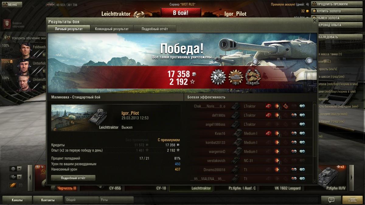Andy_TT Опубликовано: 20 апреля, 2013 Игроки 514 публикации 63 482 боя Поделиться Опубликовано: 20 апреля, 2013 (изменено) Хотя по брелкам есть спецтемы, напишу в эту. МС-1 как ротный брелок. Опыт показывает, что если как Коленкло ходить с друзьями в Чемпионку и Абсолютку, там можно собрать эксперта.Ну не у всех такие друзья, да и больно долго.Проще путь командовать ротой на МС-1, желательно средней. Понятно, есть альтернативы, Т1 и Лолтрактор. Т1 стандарт 7/42, но он не дамажит совсем. У Лолтрактора та же беда.Мося дамагер от бога, да и перками он у меня не обделен, поэтому мой выбор был предопределен.Я жесткий противник тимкила брелка на респе, кроме наблюдателя или кинооператора!Хорошему Кэпу скакать по чужим танкам не нужно.Брелок может и должен воевать с пользой. Тактика. Пока ты даешь расклад роте, присматриваешь себе второстепенное направление и чешешь туда на всех порах до приличного куста.Он должен быть несколько в стороне от путей движения противника на величину ренгена. Как правило 1 клетка и хороший куст - это100% невидимости. Если противнику это направление приглянулось - умираешь не сразу, дав поработать арте и ПТ.Если не приглянулось после успехов основной группы поддавливаешь его, иногда выходя на арту. МС-1 отлично тролит Квас группы на переднем крае в застройке.Попасть они сразу не могут, динамики хватает перебегать между домами на Редшире, Эрленберге, Мурованке.Арта 3 , 4 уровня не обладает достаточным сплешем для выкуривания МС-1.Но стрелять Квасы и арта по нему не перестают, МС-1 принимает выстрелы (не урон естественно). Орлика в средней на МС-1 фармить неверно, это напрягает роту по времени.(Для этого есть взводы и рандом).Но подстрелить 6 уровень раз в 2-3 боя - это легко.Чаще всего страдают квасы, поворот башни у них медленный. Заползаешь с тыла к недобитку,а он агрится на союзников, не берет тебя в расчет и за 3-4 выстрела в бок в ангар.Очень оживляет союзный и вражеский чат :trollface: . С Т-50 и М18 реже, но бывает. Хорошо давит МС-1 противнику на нервы на встречном бою.Приличные роты обычно занимаются друг другом, а не захватом.Став на захват, ты создаешь стресс и вытягиваешь врага под арту и стволы союзников. Иногда фармиться кроме захватчика еще и рейдер. Посмотрите на этот списочек http://noobmeter.com/tank/ru/MS-1Описанным способом я обогнал таких монстров МС-1 как СТАТА и ФОКСЫ.Но и ротку водить надо зачетную правда :trollface: . Успехов Вам, кэпы на МС-1. Изменено 20 апреля, 2013 пользователем Andy_TT 3 Ссылка на комментарий Поделиться на других сайтах Другие способы поделиться...