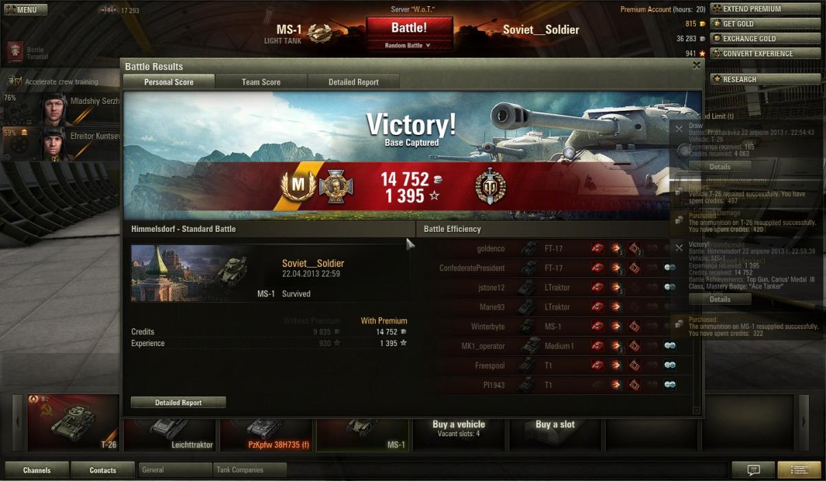 anonym_W1r0VCZpS9am Опубликовано: 23 апреля, 2013 Игроки 973 публикации 19 706 боёв Поделиться Опубликовано: 23 апреля, 2013 22 Апр 2013 - 21:19 пользователь stopkran_ сказал:Для паники нет повода. Катал сегодня гоча, и был вынесен невидимым Мосем. У него ушло 5 выстрелов, все в лоб. На гоче экипаж 100 проц и половина маскировки. Вывод- Мося с перками по прежнему смертельно для всех опасен.... это не я случаем был?За последние дни штук 10 уже отправил в ангар, для меня все эти гочи и т18 наоборот любимые фраги, едут себе так смело, не прячутся, приятно целится... всегда у меня для таких самоуверенных 34 подкалиберных припасено :playing:22 Апр 2013 - 22:25 пользователь grig54 сказал:Обратите внимание где находится МС-1.Наверно или масло чтобы туда залезть.... та ладна, спокойно туда вылазит МС, перестал туда залазить, хотя иногда получается эфективно там отстреляться... неплохо оттуда всё простреливается, кроме базы красных, мешает замок. Помню слил там Т18, который поднялся слева по серпантину, так он никак не мог понять откуда и как Ссылка на комментарий Поделиться на других сайтах Другие способы поделиться...