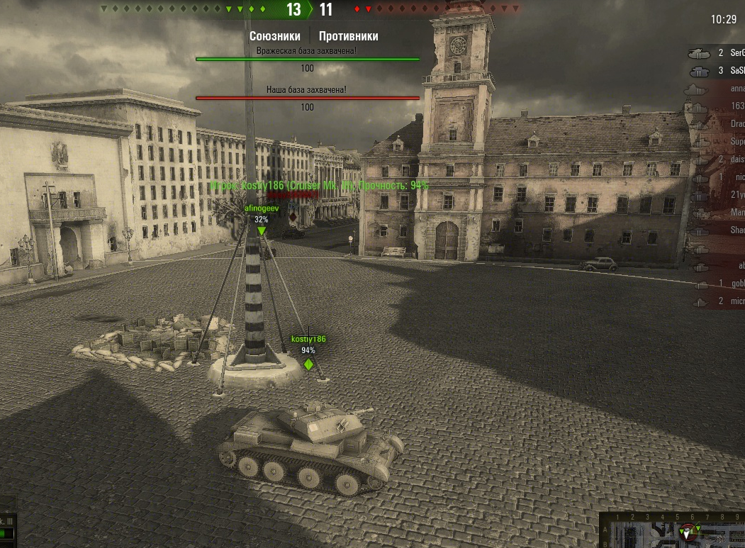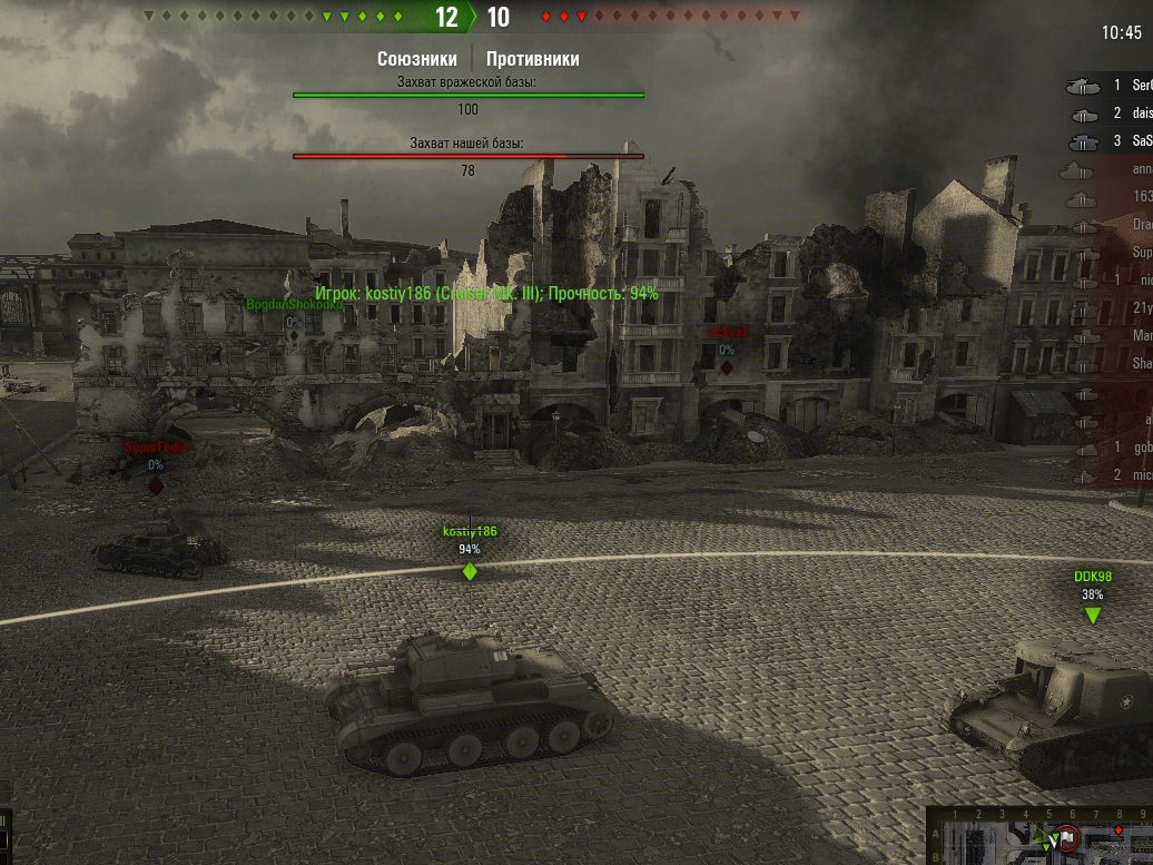 grig544 Опубликовано: 5 мая, 2013 Игроки 2 362 публикации 15 945 боёв Поделиться Опубликовано: 5 мая, 2013 (изменено) 05 Май 2013 - 13:01 пользователь stopkran_ сказал:Возможно, но продлевать бой на 16 секунд это перебор.Для того чтобы продлить бой надо убить кого-то из захвативших базу.Другие союзники не проходят.СербоШторм отвечал что сделано это специально по просьбам игроков.Время после захвата они подтвердили нефиксировано примерно 5 сек.Никакая синхронизация с сервером здесь не при чем.16 сек это перебор конечно.На скрине видно что кто-то из союзников был убит.Если на базе то время продлевается,но всё равно что-то много 5+5=10. 6 секунд украдено.Посты #425,#404 в ответах разработчиков.И еще есть в других постах.Кстати там точно такой же вопрос есть.и противоречащие друг другу соседние ответы. Изменено 5 мая, 2013 пользователем grig544 Knopka () сказал: Снаряд может вести себя довольно фривольно во время полета, но за пределы круга сведения он все равно не выйдет . В нике одна 4-ка лишняя. Отдохнул на курортах Банландии в общей сложности 25 суток. Ссылка на комментарий Поделиться на других сайтах Другие способы поделиться...