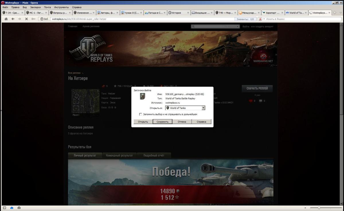 grig544 Опубликовано: 21 мая, 2013 Игроки 2 362 публикации 16 115 боёв Поделиться Опубликовано: 21 мая, 2013 (изменено) В Опере жмешь ЛКМ на "скачать реплей" на странице с реплеем.Должен появиться диалог о сохранении файлаТипа такого: http://cdn-frm-eu.wargaming.net/wot/ru/uploads/monthly_05_2013/post-13494453-0-28961900-1369154116_thumb.jpgЖмешь на "Сохранить" и указываешь куда сохранить.Или в Опере же ПКМ -"Сохранить по ссылке...." и указываешь куда сохранить.Должно пройти.Может у тебя какая прога стоит перехватывает ссылки на скачивание.Тогда ищи куда она скачивает.Обычно папка на диске С downloads называется. Изменено 21 мая, 2013 пользователем grig544 Knopka () сказал: Снаряд может вести себя довольно фривольно во время полета, но за пределы круга сведения он все равно не выйдет . В нике одна 4-ка лишняя. Отдохнул на курортах Банландии в общей сложности 25 суток. Ссылка на комментарий