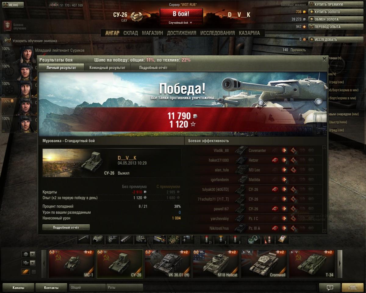 D__V__K Опубликовано: 25 мая, 2013 Игроки 761 публикация 14 383 боя Поделиться Опубликовано: 25 мая, 2013 25 Май 2013 - 18:53 пользователь Zlobnij_Ded сказал:Вы правы. По такому принципу у меня и настроен ХVM. Показывает общую эффективность, и кол. боев и % на данном танке.Шансы на победу тоже отключил.Да многие отключают, ибо сбивают с толку. Как-то недавно в начале боя один сокомандник (по оленемеру мы с ним были самые опытные) робко выдает в чат "Слив?". На что получает от меня "***, будем драться!", в ответ "Ладно, уговорил". Бой выиграли (не вдвоём, конечно же, но наш вклад был весомым). Очень прикольно уже ПОСЛЕ победы видеть шанс 30%, 20%, а бывало и 5%. Ссылка на комментарий Поделиться на других сайтах Другие способы поделиться...