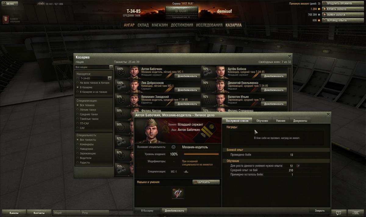 Der_Pass Опубликовано: 1 сентября, 2013 Игроки 11 466 публикаций 55 219 боёв Поделиться Опубликовано: 1 сентября, 2013 01 Сен 2013 - 16:33 пользователь demisof сказал:Подскажите новичку - купил Т-3485, захотел посадить на него прокаченый экипаж с другого..., отправил всех в казарму, а теперь не знаю, как их соответственно посадить на места? Когда захожу в казарму, выбираю нужного, кликаю правой, то у танкиста только активна икона "демобилизовать",А КАК его усадить в нужный мне танк? вот так Арта в командный чат: «Лео, узнай где они попрут». Лео в общий чат: «Где вы попрете?» Лео в командный чат: «Молчат. По ходу, деф!» bonderas® Ссылка на комментарий Поделиться на других сайтах Другие способы поделиться...