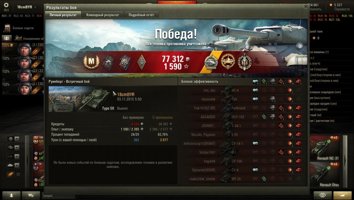 Тебе бы книги писать. Про дуло в корме е-75 и вертуханы на 300м по супу - вообще жесть. Правда жизни немного прозаичней. В руках среднего игрока тип сейчас никакой не нагибатор и уж тем более не имба. Прошли времена когда шансы на победу определяли не по оленемеру а по количеству типов в команде. Сегодняшний 59 - просто серая рабочая лошадка, машинка для добывания виртуальных кредитов. Но и в таких условиях он все еще достаточно неплох, особенно если сравнивать с премкактусами, которые ВГ последнее время штампует пачками.