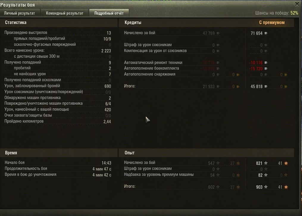 Ну и раз уже такая пьянка пошла, то у меня на 54 1600 боев, а у тебя всего 400. Но что-то стата у тебя в 1.5 раза ниже моей. Опять заговор???