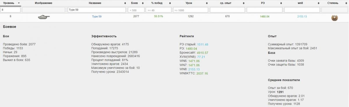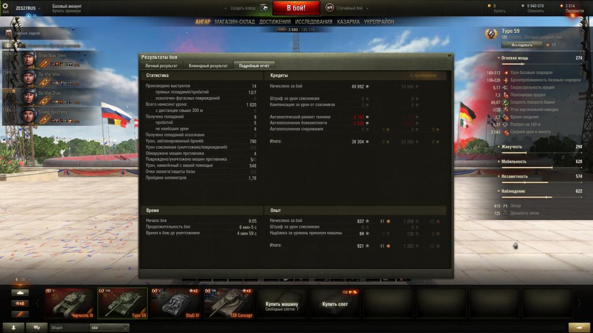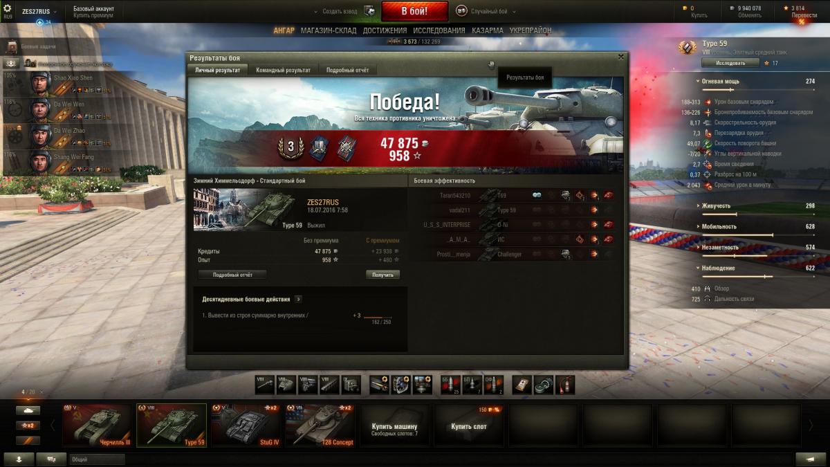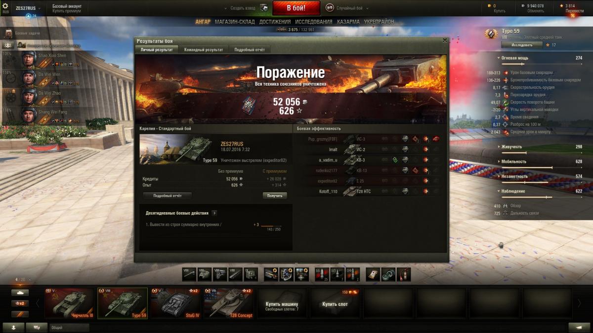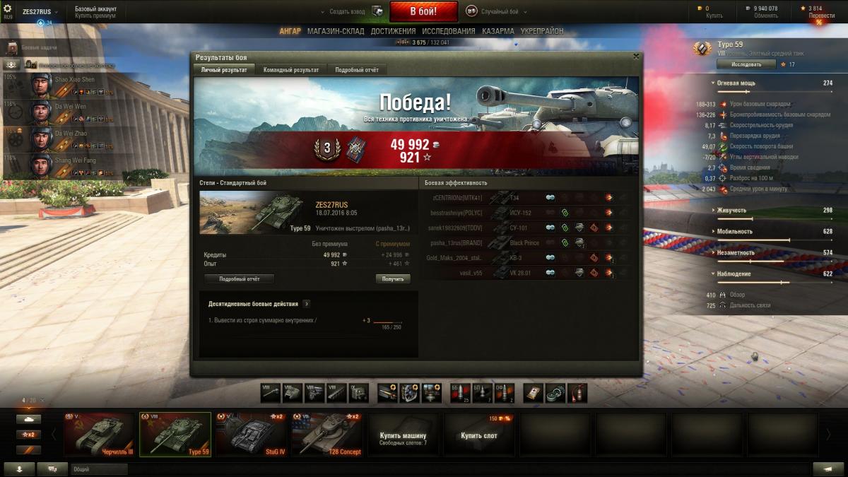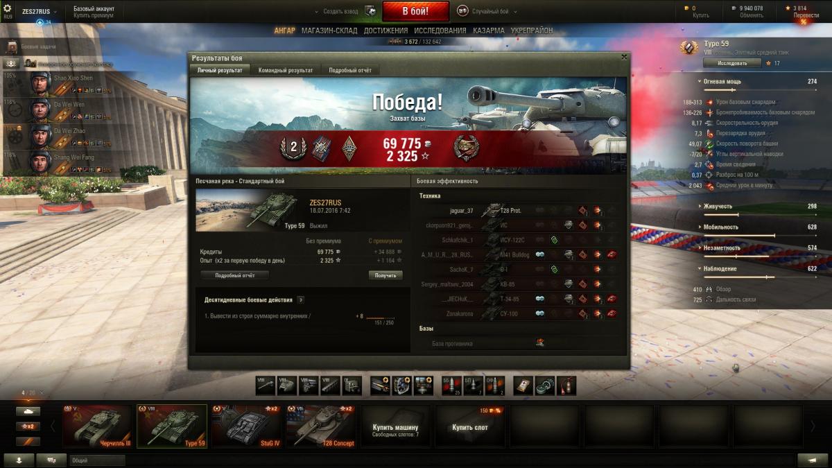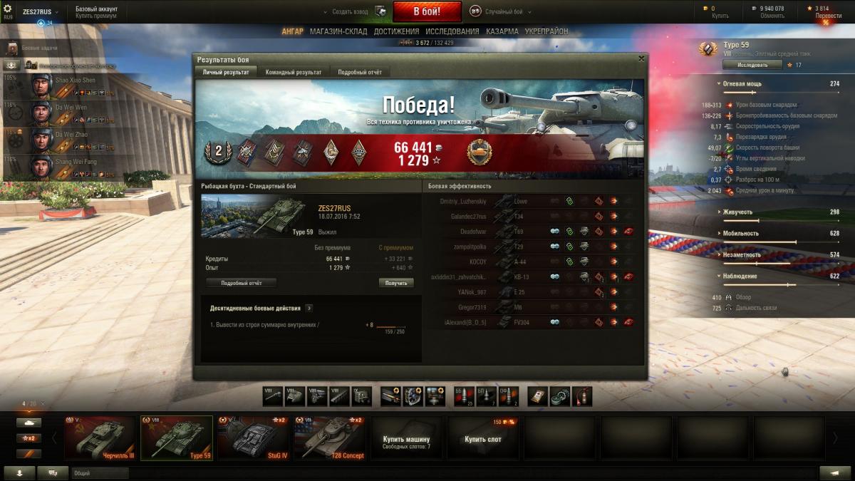 По итогу могу сказать танк годный. Да же сейчас Type 59 нагибает. Опасные противники это: Т-54, СТ1, Е75, Тапок и конечно же невидимые САУ и ПТ-САУ. Разброс орудия желает оставлять лучшего. Type 59 не предназначен, что бы сидеть в кустах. Играю исключительно агрессивно-наступательной тактикой. Танк создан, что бы давить фланги. Играл на многих прем танках и я понимаю Type 59 это моё родное.