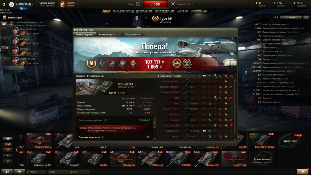 Тип59 в ангаре, это как Почётный знак ветерана WoT! Тип59 пожалуй один из самых редких и уникальных машин) Его одним из первых вывели из продажи, я бы даже сказал его случай был беспрецедентным. А хорошая стата на нём это показатель прямых рук и скила игрока, так как машинка совсем не простая, как многие думают)