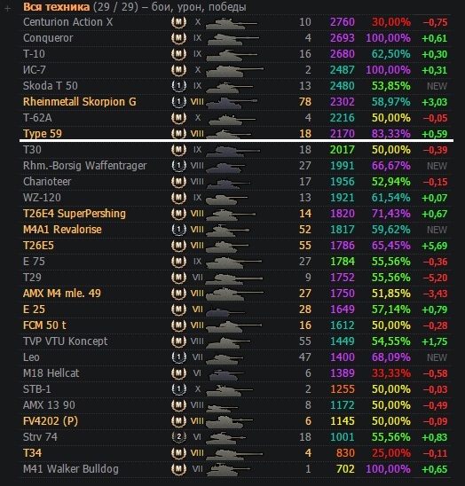 Тип 59 это по большей части голда, ФСМ и Т34 чисто на ББ. Разницу замечаешь? Мой средний на Тип 59 это 3200 ВН8, или что-то около того. При этом за большие показатели на ФСМе и Т34 я даже близко не подошел к такому рейтингу. Тупо потому что те танки настреливают на ББ больше чем Тип 59 с голдой.
