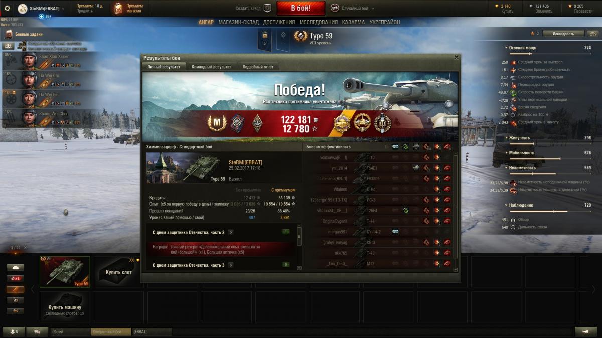 и про типа 59: пушка Г 0.39/2.9 = посадить на него того, кто в WG прикрутил такие ТТХ, и заставить в рандоме часа 3 покатать = и см, как у него стул то пригорит ))) как по мне, нужен апп хотя бы до 0.37/2.7, ибо с текущим разбросом, снаряды хз как не летят в цель...