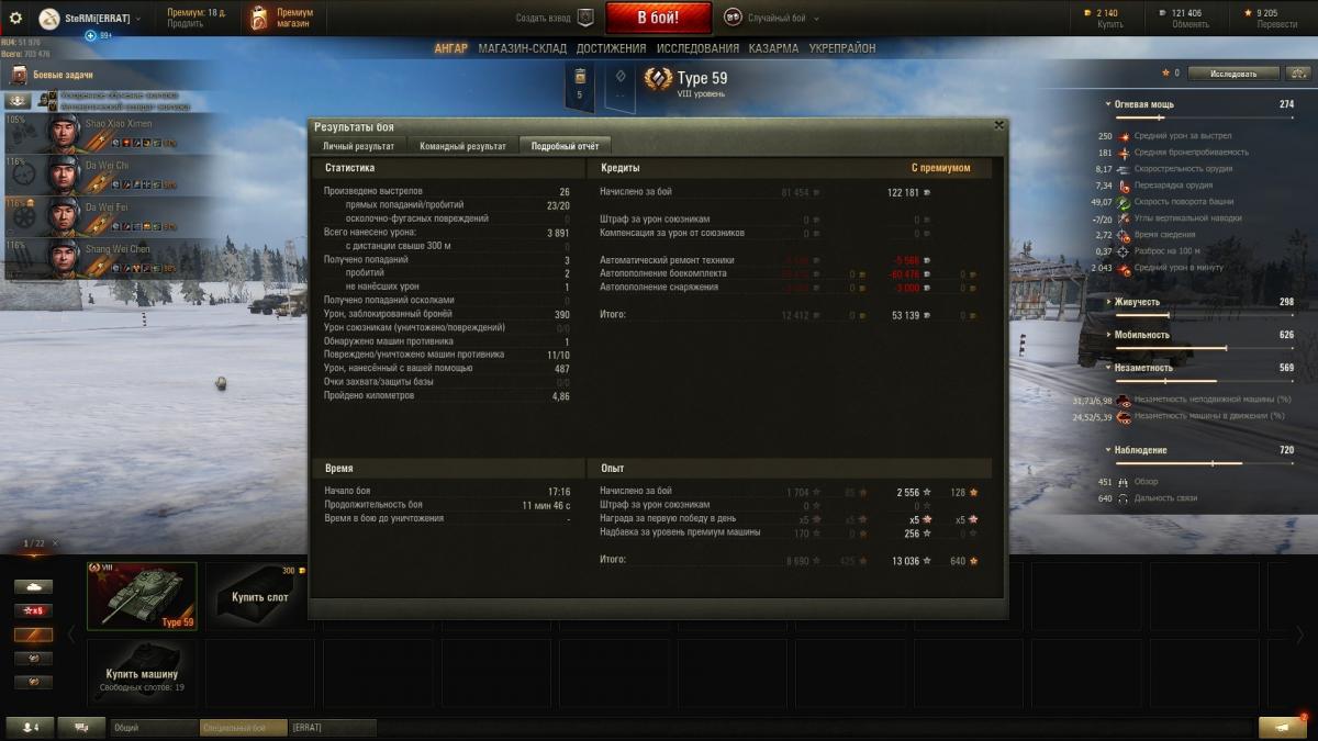 ​Тайп и с ПА, если на голде, уходит в минус :(. Увы, из всех своих прем-танков, я только нормально фармлю на Льве. Еще, если везет, то КВ-5 может танкануть неплохо, даже на голде.  Тайп59 нужно ребалансить. Хотя бы, время сведения уменьшить - с 2.9 до 2.6 (хотя бы). Перезарядку ладно уже, можно и не трогать. Хотя... Чисто сравнение.