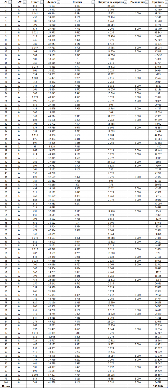 Тут не видно настрела, так что хз, нормально это или нет. Но подозреваю что там не густо, без голды то. А по поводу фарма, в моих руках ФСМ делает 44к чистыми при 2к среднего за сессию. По крайней мере по моим замерам так и выходило (20 боев). А вот на 4202 фарм вообще никакой был. Там у меня вышло меньше 30к без ПА чистыми. Правда отрезок был меньший (на длинный нервов не хватило), всего 10 боев. Но его с тех пор апнули по доходности (на 10%) и по ТТХ (максималку до 50 довели). Вообще, в последнее время если и хочу пофармить, то сажусь на Скорпа.