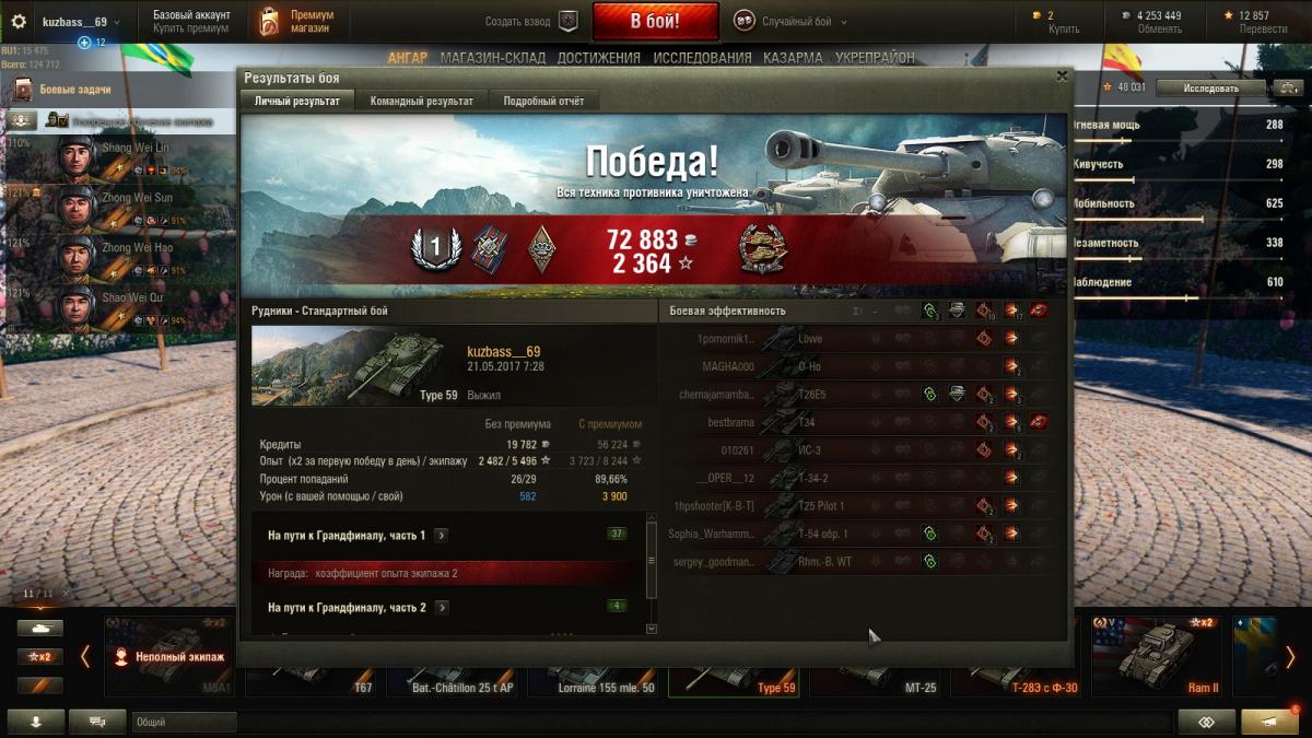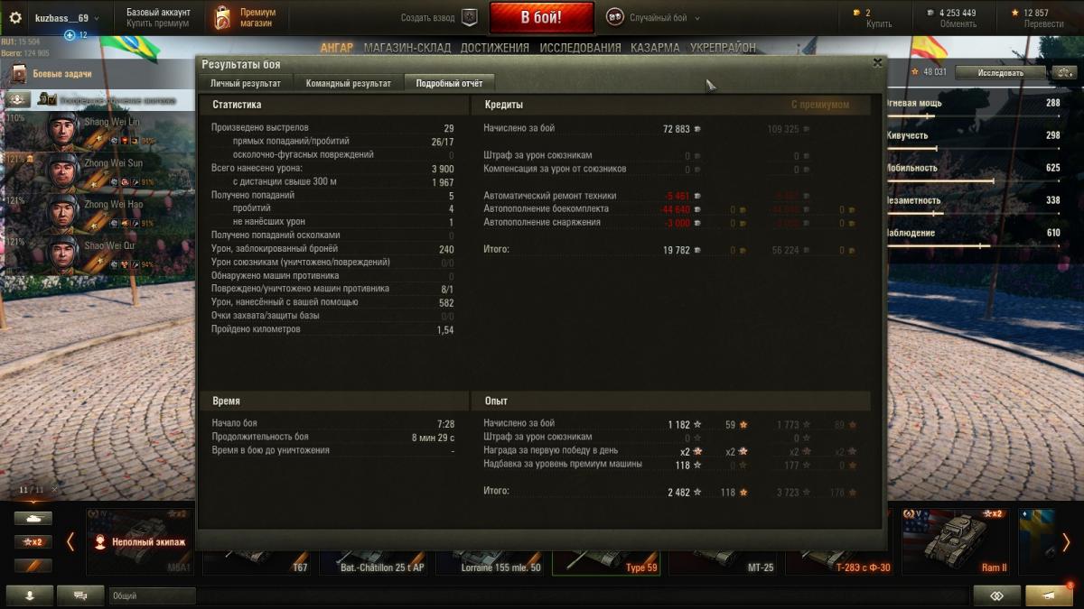 Вчера в укрепе удалось на Типе-59 на первое место в рейте команды забраться и по опыту, и по урону. Наверное, противники думали, что Тип-59 так плох, что пытались пробить мне на рандоме ббшками скорпиона и иса-3 башню и влд под какими-то дикими углами.