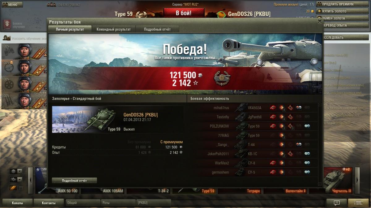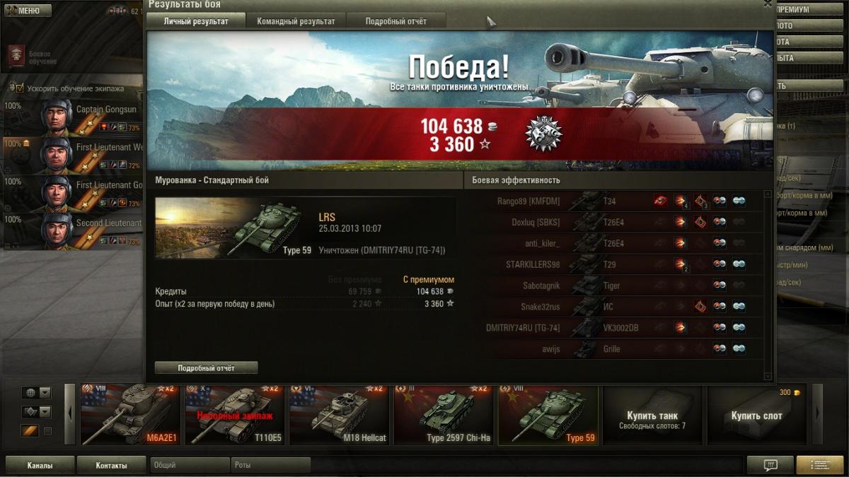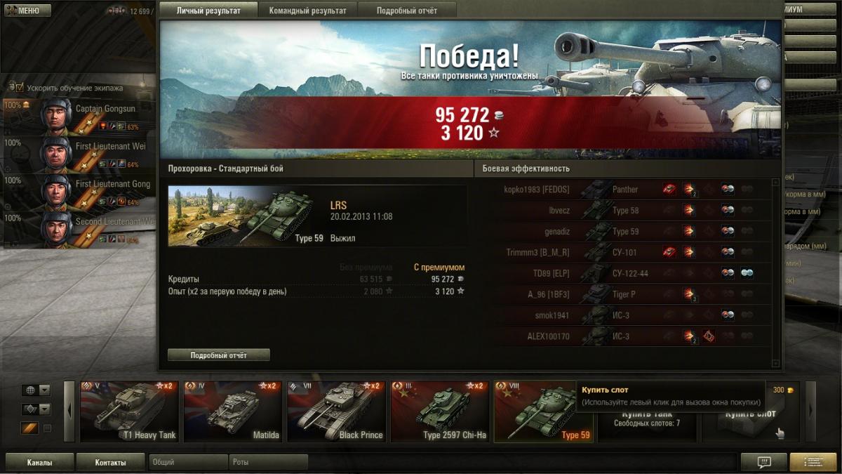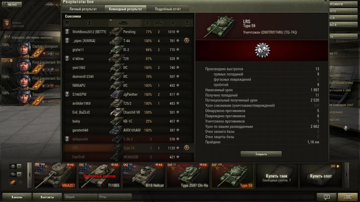 Конечно они выборочные , никто не будет отщелкивать все бои подряд . Оставляешь то что чем то зацепило , то что было интересно . А вот скринов где меня рвут как тряпку вряд ли смогу найти ..... если только специально слиться . Я специально не выкладывал скрины с действительно хорошим результатом .... там начисления больше 150000 кр их в самом деле мало . А то что выложил они весьма средние , там просто для меня интересные моменты .... на одном есть уничтоженный СТ-1 к примеру причем в одно рыло против трех машин , на одном медаль дозорного получившаяся абсолютно случайно . ну и так далее . Это просто интересные моменты для меня самого . И я никого не нагибаю .... что блин за фраза дурацкая ? Я просто не подставляюсь , я берегу ХП своего танка , я не лезу в близкий бой без крайней необходимости , я выжимаю все на что способен 59 под моим управлением . Я никогда не использовал на нем ни масла , ни вентилятора , ни боевого братства . Из модулей у меня стоит просветленка , стабилизатор и досылатель . Из перков экипажа у всех маскировка , у всех ремонт . плюс еще по одному индивидуальному .