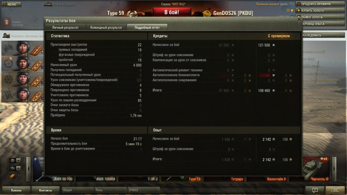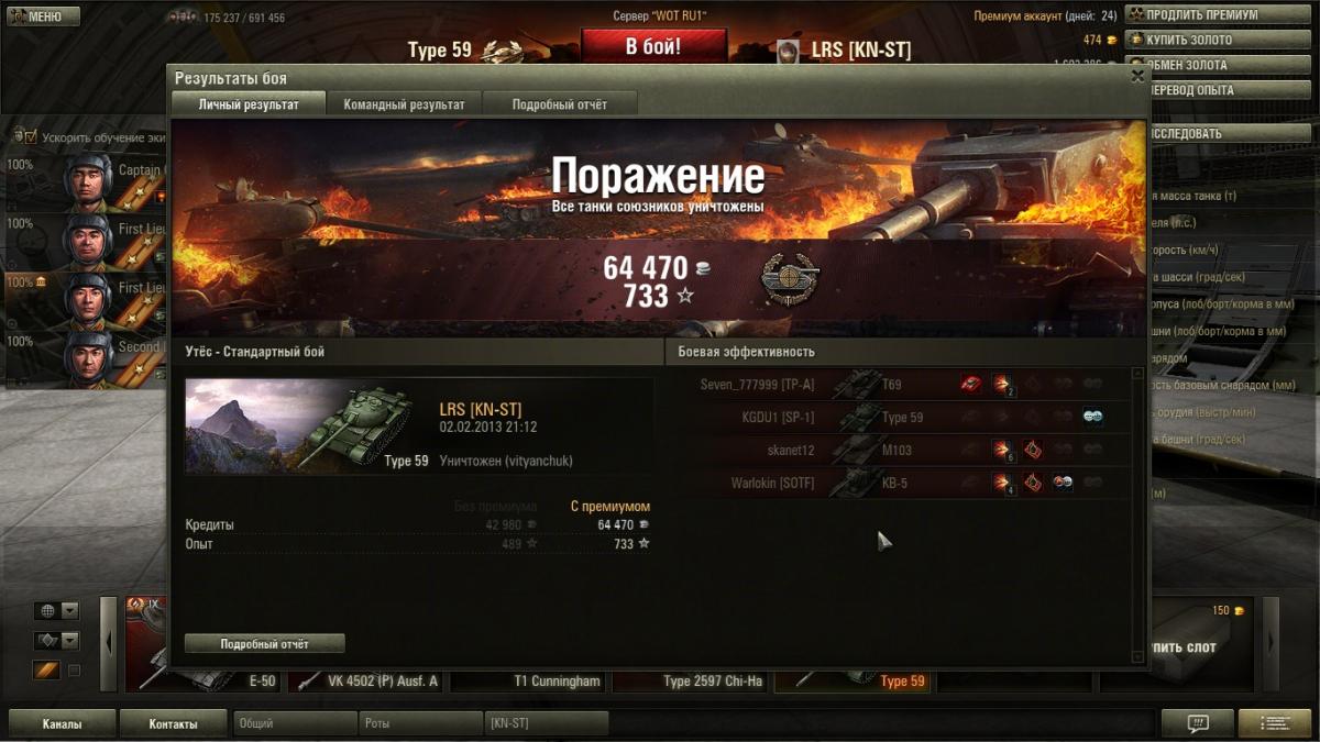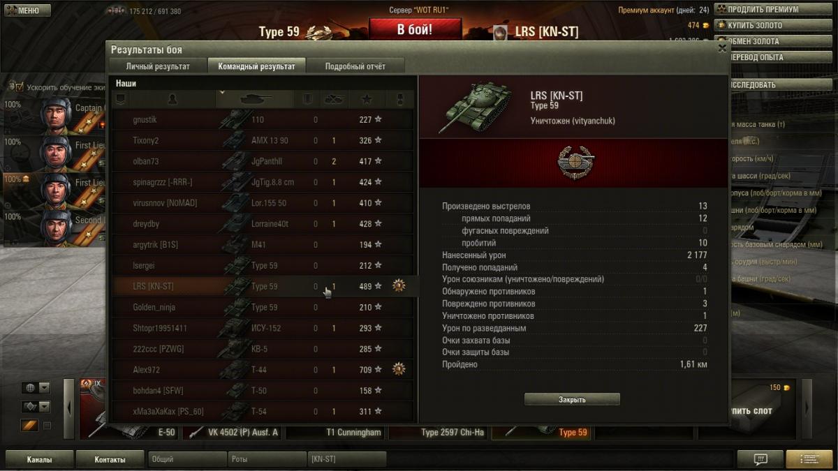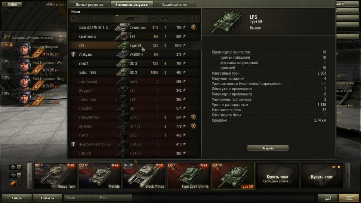 Конечно они выборочные , никто не будет отщелкивать все бои подряд . Оставляешь то что чем то зацепило , то что было интересно . А вот скринов где меня рвут как тряпку вряд ли смогу найти ..... если только специально слиться . Я специально не выкладывал скрины с действительно хорошим результатом .... там начисления больше 150000 кр их в самом деле мало . А то что выложил они весьма средние , там просто для меня интересные моменты .... на одном есть уничтоженный СТ-1 к примеру причем в одно рыло против трех машин , на одном медаль дозорного получившаяся абсолютно случайно . ну и так далее . Это просто интересные моменты для меня самого . И я никого не нагибаю .... что блин за фраза дурацкая ? Я просто не подставляюсь , я берегу ХП своего танка , я не лезу в близкий бой без крайней необходимости , я выжимаю все на что способен 59 под моим управлением . Я никогда не использовал на нем ни масла , ни вентилятора , ни боевого братства . Из модулей у меня стоит просветленка , стабилизатор и досылатель . Из перков экипажа у всех маскировка , у всех ремонт . плюс еще по одному индивидуальному .