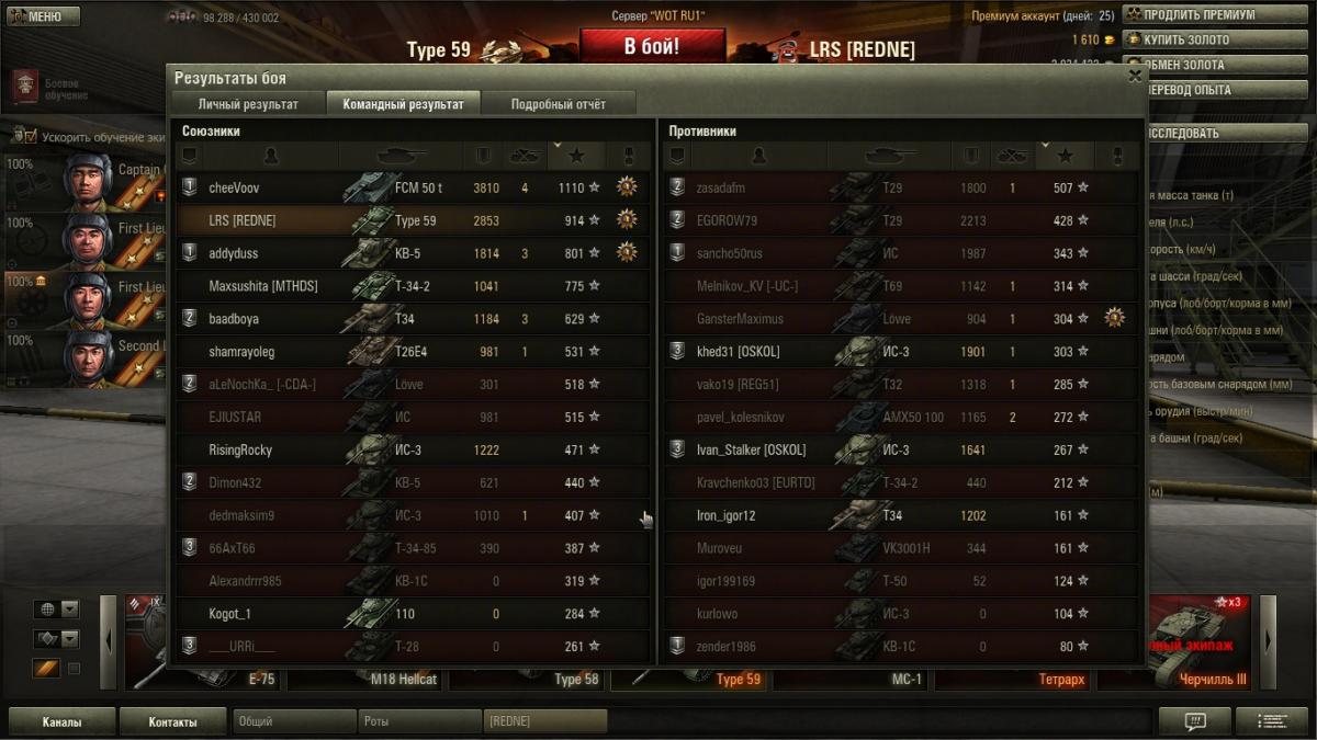 Вот сегодняшний выезд на Типе 59 .... всего один , времени больше не было . Вроде все как всегда , никакого особого геройства . Светил , дразнил , стрелял , вытаскивал под ФЦМ-50 который сидел за камнем , его совзводник стоял в чуток за холмом . я пользуясь своей броней высовывался и дразнил противников , народ лез за мной и получал подарки , было весело . если посмотреть внимательно то видно что в нашей команде именно три према , ФЦМ-50 , КВ-5 и я на Типе -59 нанесли наибольший урон по противнику .