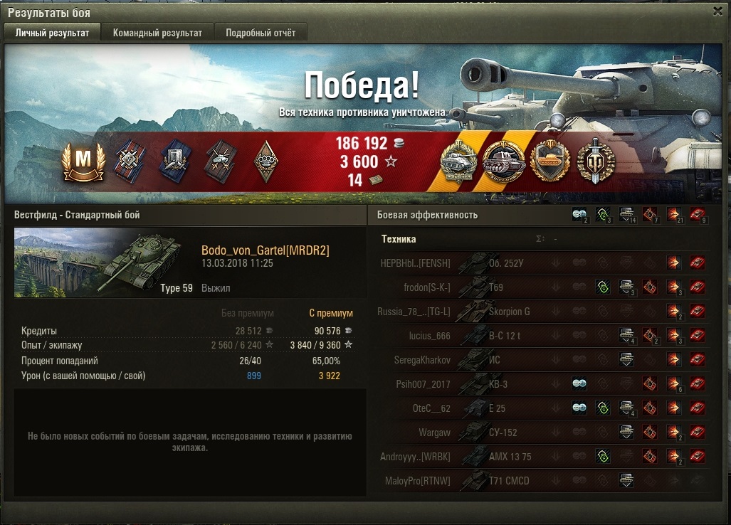 Весь бой просто отличная иллюстрация крахмального казино - то на полной сводке не попадаешь, туда куда хочешь, то с вертухи выносишь. Также была просто пара прекрасных шотов. Пробил 252У (см.скрин), а ведь целил в скулу. Думаю, у твинка реально бомбануло.