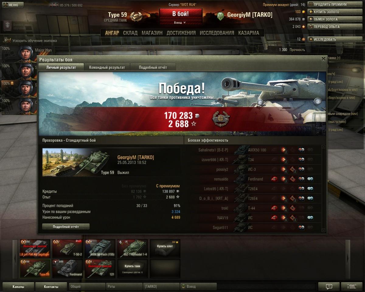 Сделал себе подарок на день рождения - удалил к херам  последний танк  в ангаре - тип59 и покинул игру.  Не могу больше играть в рандоме а на групповухи времени нет. В рандомах соло помоему только мазахисты на тт играют теперь... вообще редко удачные бои получаются... одна и та же картина - стадо тт 45-46% побед в одной команде и взвод 52+ в другой и ололораш стада со сливом. В общем - удачи всем и мне будет всегда не хватать тип59 каким он был в начале и когда не было голды за серебро.
