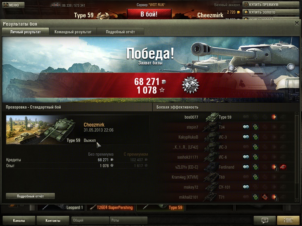 И тем кто хочет тип 59: зачем он вам? Если даже его в продажу "пустят", то, учитывая то что его заиметь хотят почти все, опять его раскупят как горячие пирожки, но потом окажется что мясо гнилое (для тех кто не понял: его понерфят).