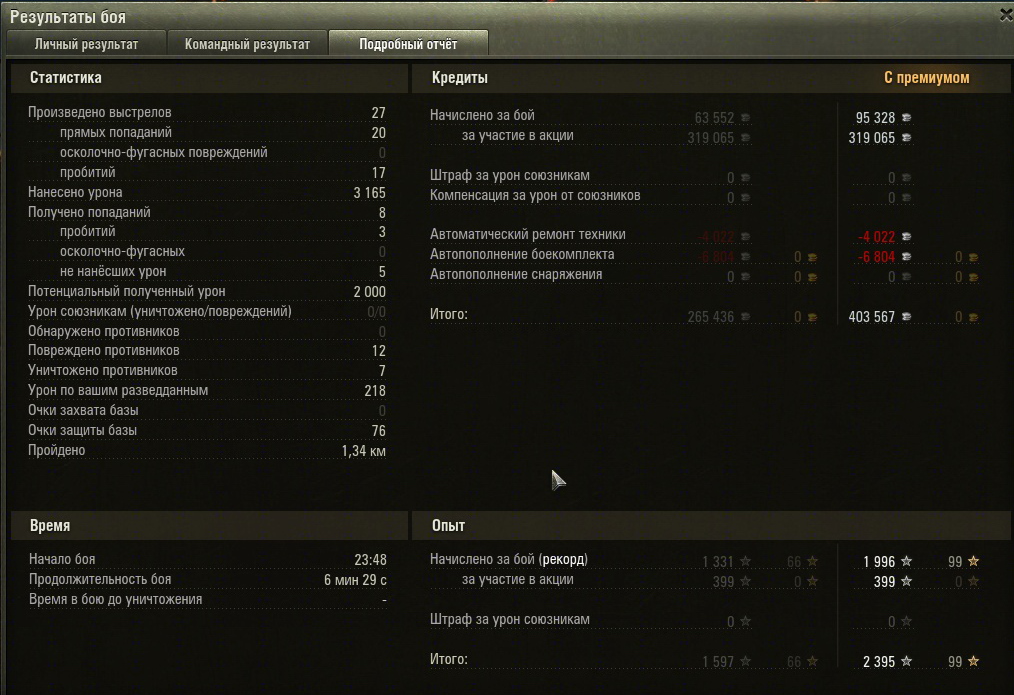 привет. вот подробные цифры с задней обложки (неплохой, но вполне заурядный бой с типом в топах). как верно заметил товарищ выше, честный навар "чуть меньше 100к". откровенно говоря, не очень понял логику начисления акционного бонуса. по текущим боевым задачам там только 20% к заработку и опыту укладывается за первую строчку в рейтинге, однако надбавка явно больше 20%. возможно, дело в полученных медалях