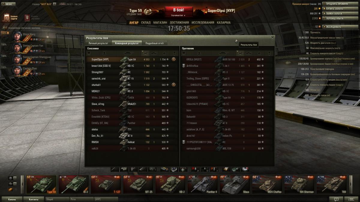 Можно подробнее, куда его пробивали КВ-5 и Львы, кроме как в бока и зад? Или ужас в виде 5-6 Типов, летящих по полю и вырезающих команду противника за минуту уже забыт? Нынешний 59 - это бледная тень Типа прошлогоднего. Особенно после его последнего "апа" - накинули тонну веса, увеличили время перезарядки и обкакали точность. КВ-5 быстрее перезаряжается, чем 59 при лучшей альфе и точности орудия. Только за счет рук и скорости танка еще можно зарабатывать, в остальном обычное усредненное среднеигровое нечто.