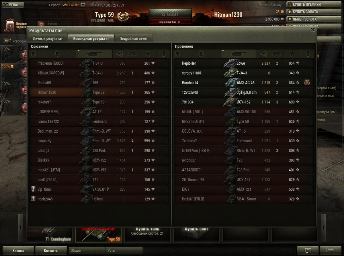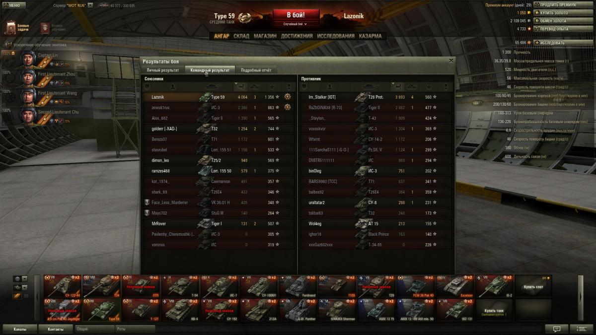 Можно подробнее, куда его пробивали КВ-5 и Львы, кроме как в бока и зад? Или ужас в виде 5-6 Типов, летящих по полю и вырезающих команду противника за минуту уже забыт? Нынешний 59 - это бледная тень Типа прошлогоднего. Особенно после его последнего "апа" - накинули тонну веса, увеличили время перезарядки и обкакали точность. КВ-5 быстрее перезаряжается, чем 59 при лучшей альфе и точности орудия. Только за счет рук и скорости танка еще можно зарабатывать, в остальном обычное усредненное среднеигровое нечто.