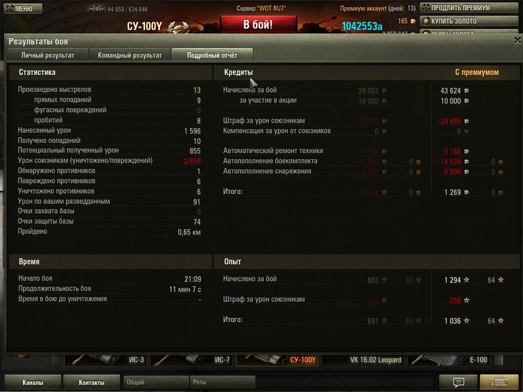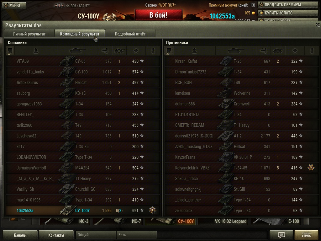 Экипаж от Объекта 704, по 3 скилла. Маскировку сбрасывать не стал поскольку пригодится на 268. Конечно хотелось бы боевое братство, но придётся потерпеть. Второй наводчик ещё даже первый скилл не выкачал. Спустя 100 боёв средний дамаг 1280, что вобщем неплохо, но и не супер. В среднем уничтожено 1,81 танка за бой. Рейтинг эффективности танка 2270, если я правильно понял. С процентом побед не заладилось, за 100 боёв всего 55% побед. Мне Игрек понравился. Всё таки люблю здоровенные и мощные пушки, и ради этого готов терпеть сарайность. Только что с двух снарядов вынес 100% Тигра Порше. Сначала зарядил голдовым ББ в бочину, он погорел, и добил вторым выстрелом. Иногда попадаешь по далеко стоящим врагам и проходит хороший урон, прям даже видно что враг отхватив плюху на 500 охреневает, кто это его так, это же средние уровни, здесь Маусганов нету...