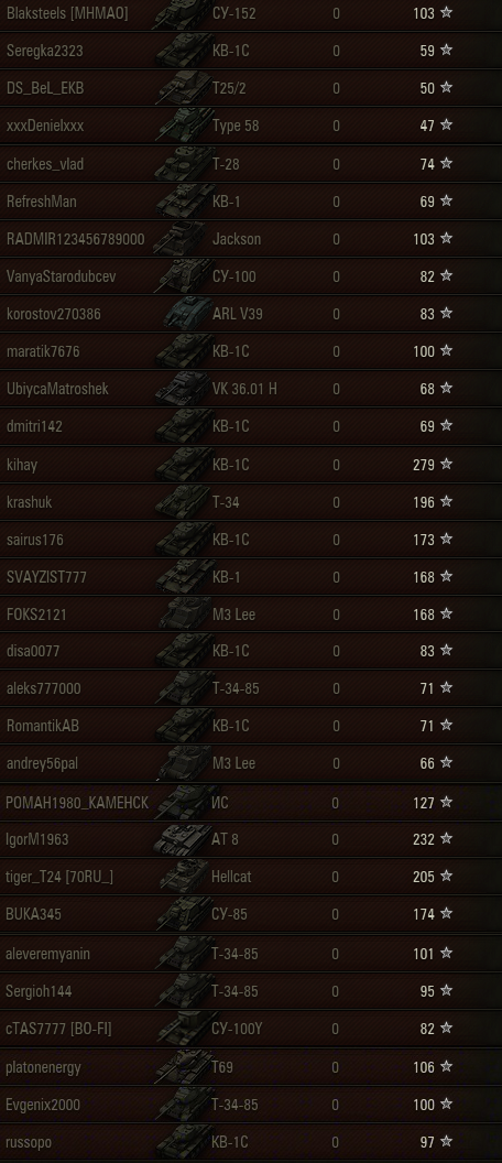 дошел до : Т-62а, ИС-4, ИС-7, Т29, СУ-14, AMX13-90, СУ-85, JgPz4, Tiger, Centurion Mk.7\1, WZ-132 / Lоwe, M6A2E1, ИС-6, Type 59, T26E4, FCM 50 t