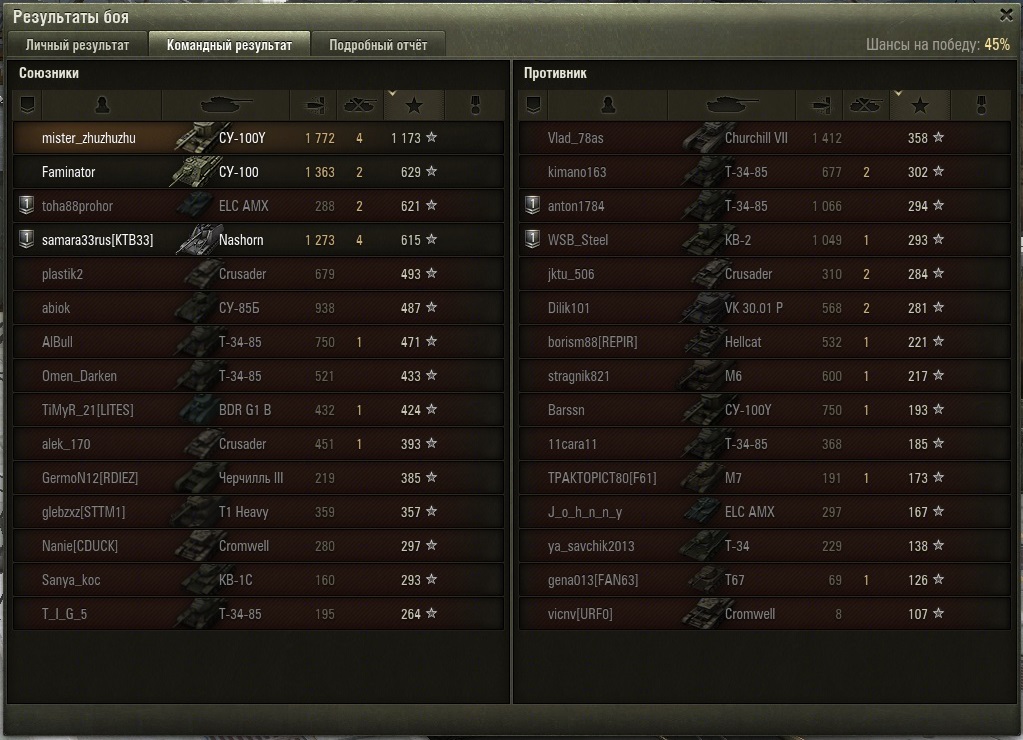 Я бы даже сказал не то чтобы не лезть вперед, а смотреть на миникарту и действовать наверняка. Выстрел на выстрел мы можем разменять, в городе можно действовать довольно нагло. А на открытых картах... Вот реплей, смотрите как я играл на су-100у против 29 человек на открытой карте