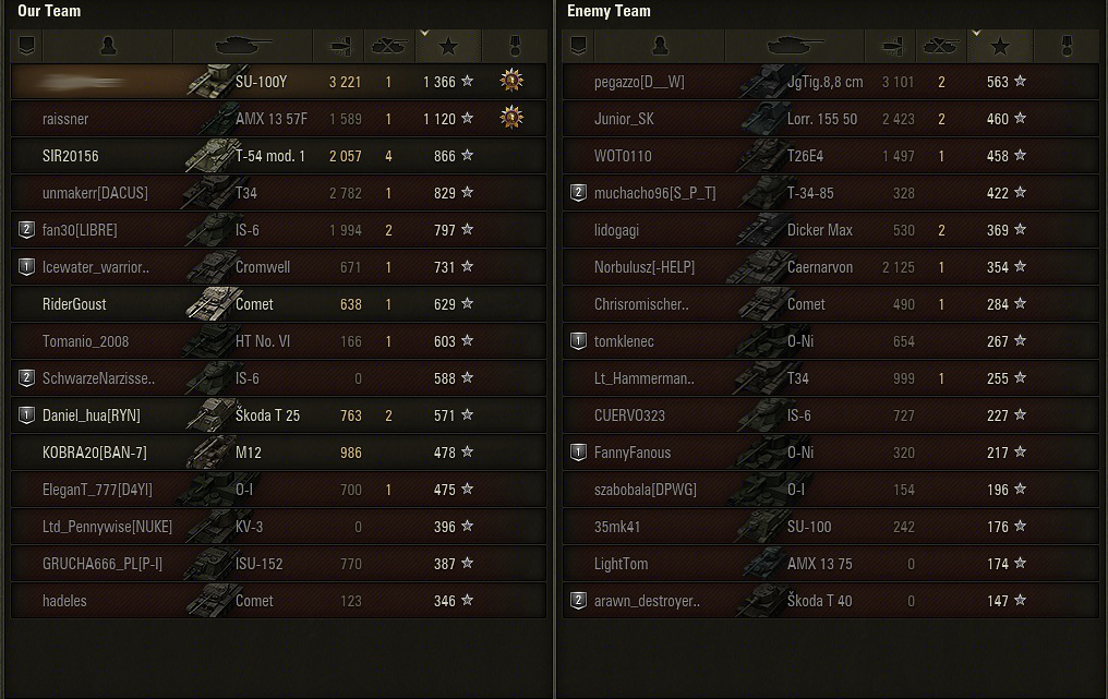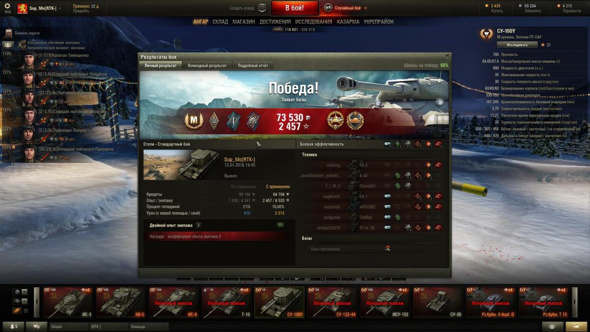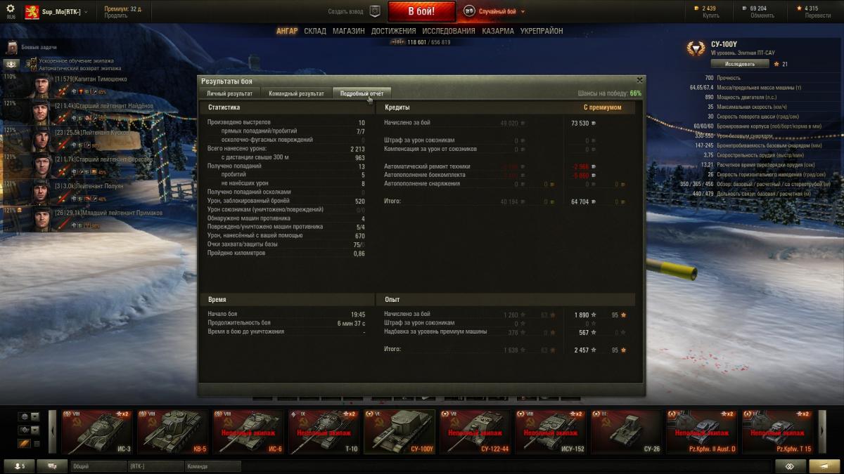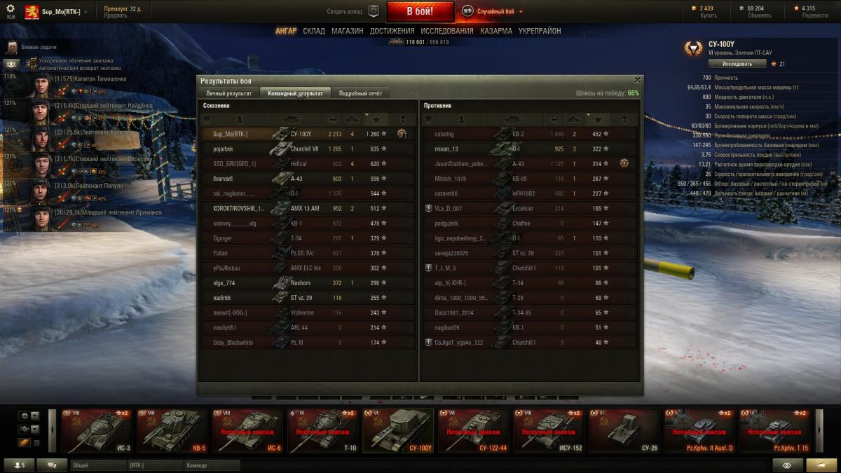 Друг подарил СУ-100Y на ДР. Сказал выбирай между AT-15A и Heavy Tank No. VI. Ну я и выбрал. Т.к. опыта игры на ПТ-САУ почти не имел, то в начале пришлось очень непросто. После 60 боёв получил 1-ю отметку на ствол. Играю соло. Побед пока 55%. Средний урон подбирается к 1000. Впечатления, в общем, положительные. Пушка что надо. Очень доставляют подрывы БК технике VI уровня и ниже. Если в setup'е боя нет сильно бронированных целей, то 3 премиумных боеприпаса отправляю первыми в сторону противника. Подвижность неплохая, как для такой массы. Не хватает обзора и лобового бронирования. Фарм считаю удовлетворительным. Не оч. высокий, но и не совсем чтобы никакой. Сейчас из оборудования установлены: СТ+ОДКК+УПП. Экипаж изучил маскировку. Комфорта стало больше. Вроде как уже не светишься через всю карту.