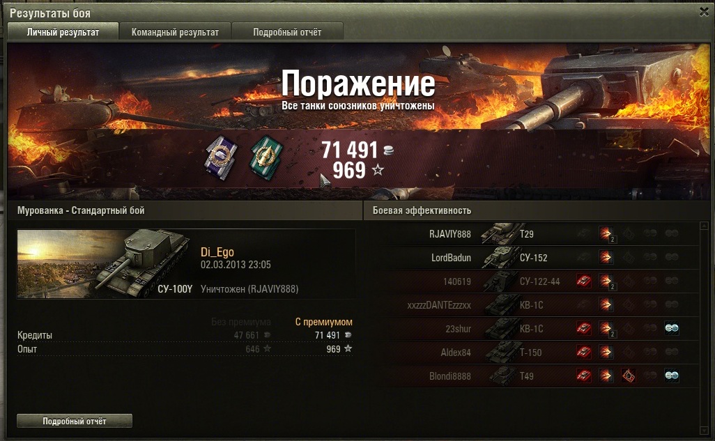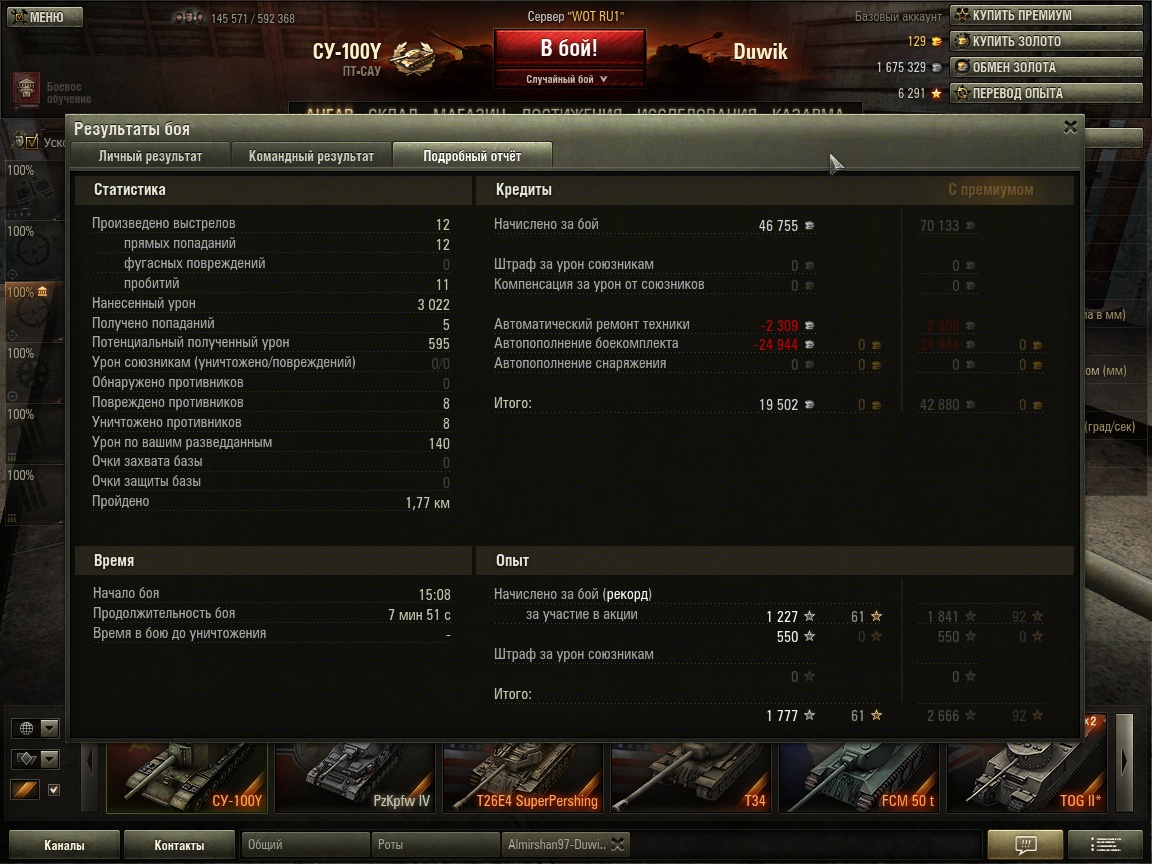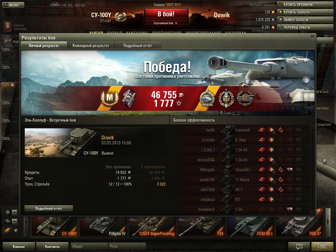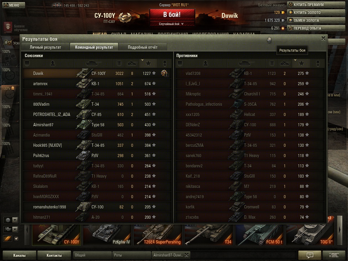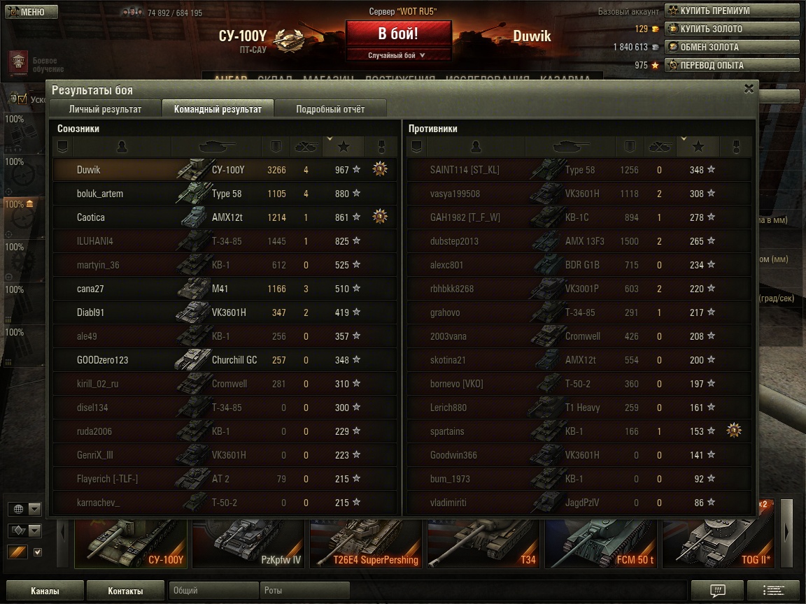 PS: Обычный бой... Встал на А3 и отстреливал тяжей что приехали туда, потом поехал добивать остальных.