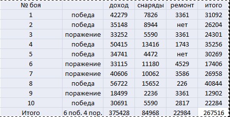 вот кстати моя табличка доходности за 10 боев если кому интересно...фарм для 6 лвл нормальный...в последующем можно будет и больше...так как привыкну к машинке =)