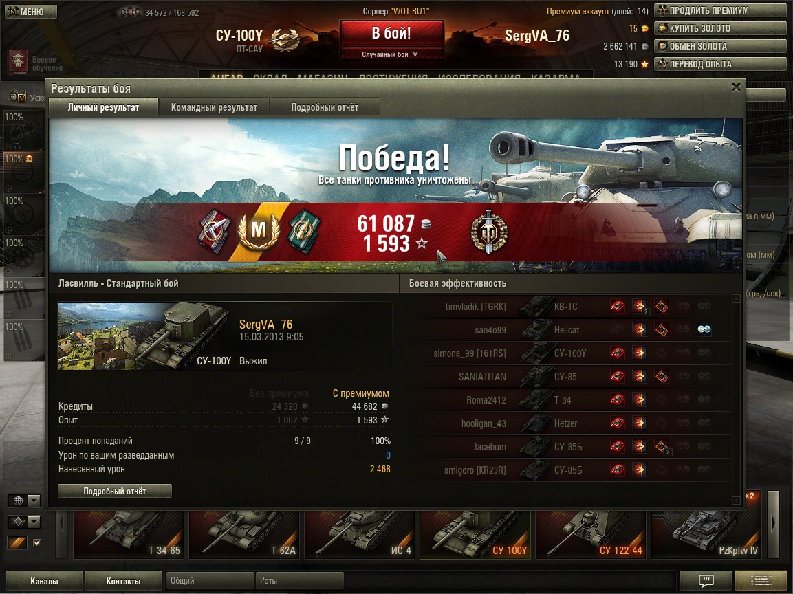 2 месяца, 2к боёв. Маловато у вас опыта для такого према. Я на нём максимально 89К брал. Позиция удачная попалась, да и за недобитками неохотился.