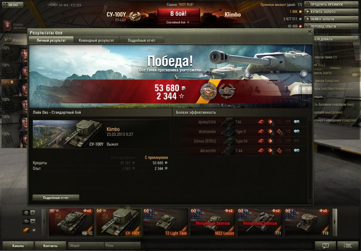 Победа! Бой: Рыбацкая бухта 22 марта 2013 г. 23:30:48 Танк: СУ-100Y Получено опыта: 3 336 (x2 за первую победу в день) Получено кредитов: 71 092 Достижения в бою: Знак класcности «Мастер»