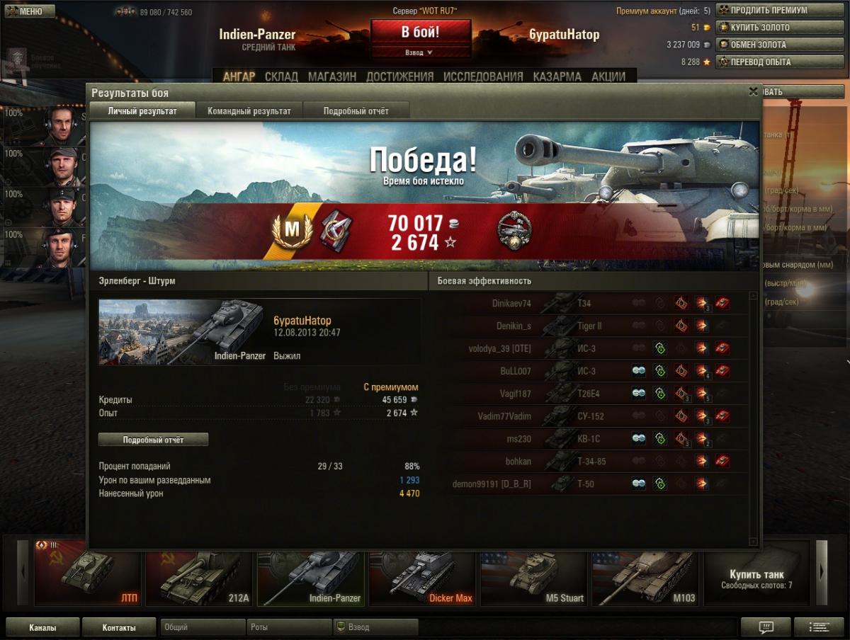 Добротный танчег, может даже в ангаре останется. БК критуют редко, за 150 боев не взорвали ни разу. Бывают приколы типа рикошетов от маски от орудий вроде БЛ-10. Сама пушка хороша, кд вообще улет, но косовата, частенько случается что на 400+ метров мажет, вот уж этого у Инда не отнять (может это все мои кривые руки и привычка шмалять с вертухи). И скорость маловата, но это терпимо. Но в общем мне танк понравился. На твердую 4+