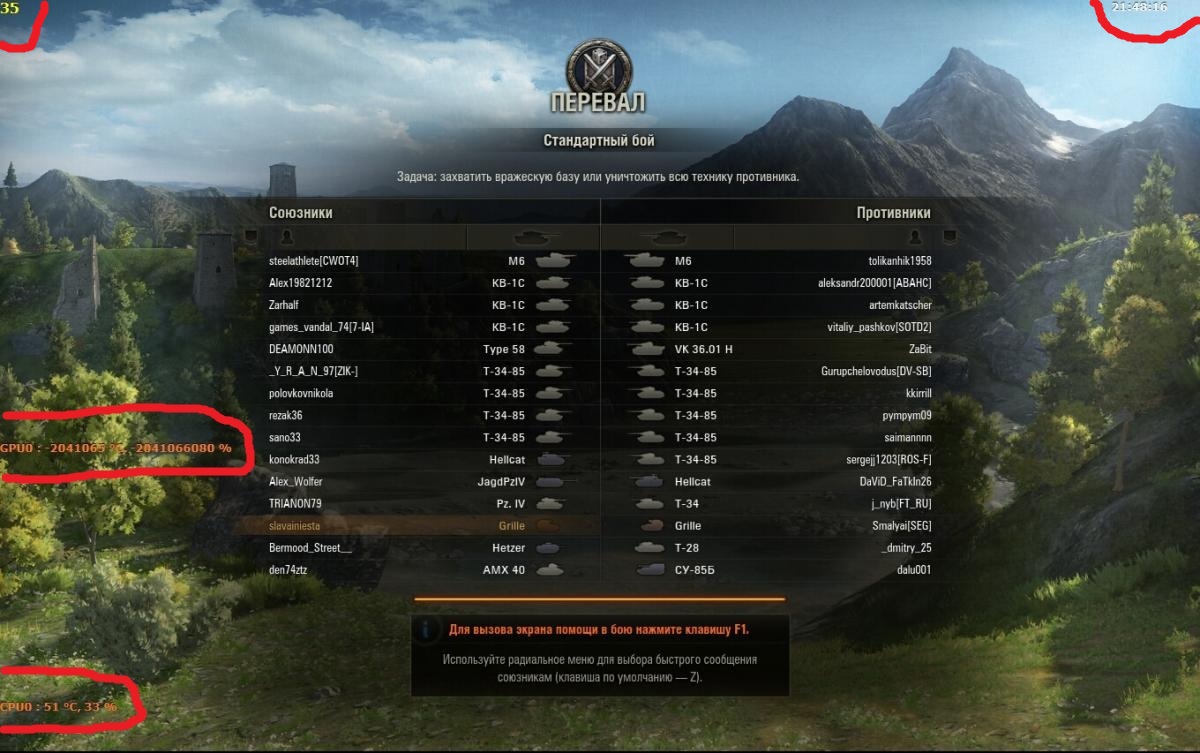 Cnpocu_kak Опубликовано: 22 июня, 2013 Игроки 1 467 публикаций 29 438 боёв Поделиться Опубликовано: 22 июня, 2013 22 Июн 2013 - 19:05 пользователь slavainiesta сказал:В бой не загружается,причем модов нету,чистый клиент . на картинках в правом верхнем углу время,два скриншота с разницей ы 1 минуту(((Ну да, а что у тебя там показывает на клиенте ядро процессора и температуру? Удали моды или сторонний софт. Ссылка на комментарий
