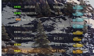 Yura_Krasnodar78 Опубликовано: 28 октября, 2024 Игроки 292 публикации 140 096 боёв Жалоба Поделиться Опубликовано: 28 октября, 2024 (изменено) Как сейчас на барабанные танки в ушах прописать ЦВЕТНУЮ звёздочку (в том файле который я прикрепил)? Барабанных стало так много, что их нужно в ушах выделять для работяг и мало играющих. Spoiler { // Options for the "short" panels - panels with frags and vehicle icon. // Режим ушей "short" - короткие уши (фраги и иконка танка). "short": { // false - disable. // false - отключить. "enabled": true, // Displayed standard fields in this mode and their order. // Available names: "frags", "badge", "nick", "vehicle", "prestige". // Отображаемые стандартные поля в данном режиме, и их порядок. // Допустимые названия: "frags", "badge", "nick", "vehicle", "prestige". "standardFields": [ "frags" ], // Width of area for switching to "large" mode on mouse over. // Ширина области переключения в режим "large" при наведении мыши. "expandAreaWidth": 230, // true - disable platoon/rank icons. // true - убрать отображение иконки взвода/ранга. "removeSquadIcon": false, // Transparency of the squad icon. // Прозрачность иконки взвода. "squadIconAlpha": 100, // Offset of X value for vehicle icon. // Смещение координаты X для иконки танка. "vehicleIconOffsetXLeft": 0, "vehicleIconOffsetXRight": 0, // Offset of X value for vehicle level. // Смещение координаты X для уровня танка. "vehicleLevelOffsetXLeft": 0, "vehicleLevelOffsetXRight": 0, // Transparency of vehicle level. // Прозрачность уровня танка. "vehicleLevelAlpha": 100, // Offset of X value for frags column. // Смещение координаты X для поля фрагов. "fragsOffsetXLeft": 0, "fragsOffsetXRight": 0, // Width of the frags column. Default is 24. // Ширина поля фрагов. По умолчанию: 24. "fragsWidth": 24, // Display format for frags (macros allowed, see macros.txt). // Формат отображения фрагов (допускаются макроподстановки, см. macros_ru.txt). "fragsFormatLeft": "{{frags}}", "fragsFormatRight": "{{frags}}", // Shadow for frags field (default null = no shadow, as in vanillas client). // Тень для поля фрагов (по умолчанию null = без тени, как в чистом клиенте). "fragsShadowLeft": null, "fragsShadowRight": null, // Offset of X value for badge column. // Смещение координаты X для поля нашивки. "rankBadgeOffsetXLeft": 0, "rankBadgeOffsetXRight": 0, // Width of the badge column. Default is 24. // Ширина поля нашивки. По умолчанию: 24. "rankBadgeWidth": 24, // Transparency of the badge icons. // Прозрачность иконки нашивки. "rankBadgeAlpha": "{{alive?100|70}}", // Offset of X value for player name column. // Смещение координаты X для поля имени игрока. "nickOffsetXLeft": 0, "nickOffsetXRight": 0, // Minimum width of the player name column. Default is 46. // Минимальная ширина поля имени игрока. По умолчанию: 46. "nickMinWidth": 46, // Maximum width of the player name column. Default is 158. // Максимальная ширина поля имени игрока. По умолчанию: 158. "nickMaxWidth": 158, // Display format for player name (macros allowed, see macros.txt). // Формат отображения имени игрока (допускаются макроподстановки, см. macros_ru.txt). "nickFormatLeft": "<font face='mono' size='{{xvm-stat?13|0}}' color='{{c:xr}}' alpha='{{alive?#FF|#80}}'>{{r}}</font> {{name%.{{anonym?13|15}}s~..}}{{anonym? <font face='xvm' size='19'>Ğ</font>}}<font alpha='#A0'>{{clan}}</font>", "nickFormatRight": "<font alpha='#A0'>{{clan}}</font>{{name%.15s~..}} <font face='mono' size='{{xvm-stat?13|0}}' color='{{c:xr}}' alpha='{{alive?#FF|#80}}'>{{r}}</font>", // Shadow for player name field (default null = no shadow, as in vanillas client). // Тень для поля имени игрока (по умолчанию null = без тени, как в чистом клиенте). "nickShadowLeft": null, "nickShadowRight": null, // Offset of X value for prestige level. // Смещение координаты X для уровня элитности. "prestigeOffsetXLeft": 0, "prestigeOffsetXRight": 0, // Offset of X value for vehicle name column. // Смещение координаты X для поля названия танка. "vehicleOffsetXLeft": 0, "vehicleOffsetXRight": 0, // Width of the vehicle name column. Default is 72. // Ширина поля названия танка. По умолчанию: 72. "vehicleWidth": 72, // Display format for vehicle name (macros allowed, see macros.txt). // Формат отображения названия танка (допускаются макроподстановки, см. macros_ru.txt). "vehicleFormatLeft": "{{vehicle}}", "vehicleFormatRight": "{{vehicle}}", // Shadow for vehicle name field (default null = no shadow, as in vanillas client). // Тень для поля названия танка (по умолчанию null = без тени, как в чистом клиенте). "vehicleShadowLeft": null, "vehicleShadowRight": null, // true - disable enemy spotted status icons. // true - убрать отображение иконки статуса засв