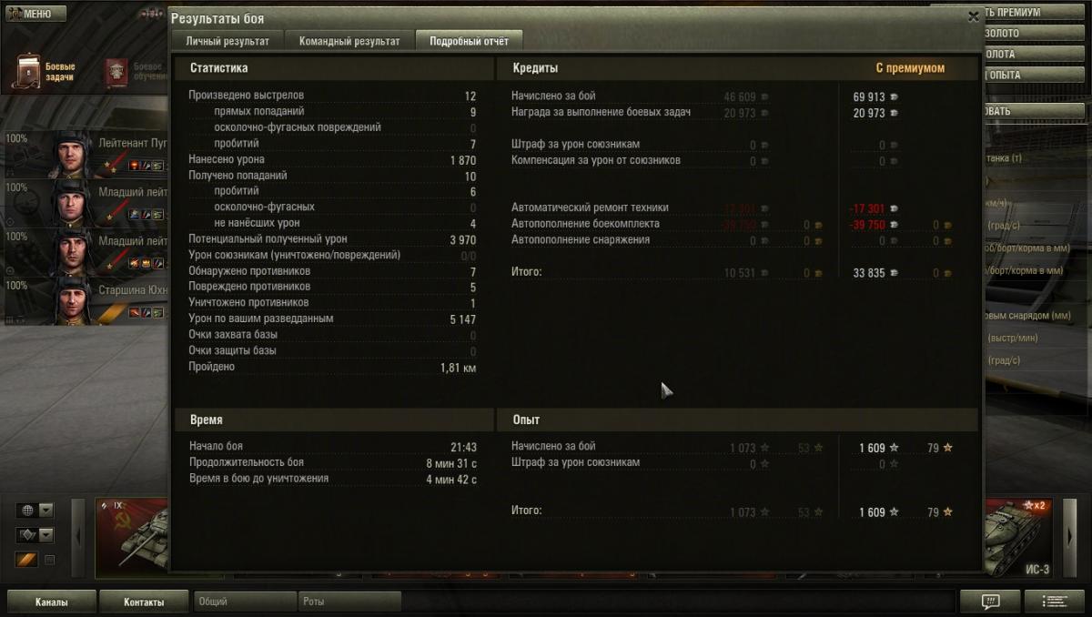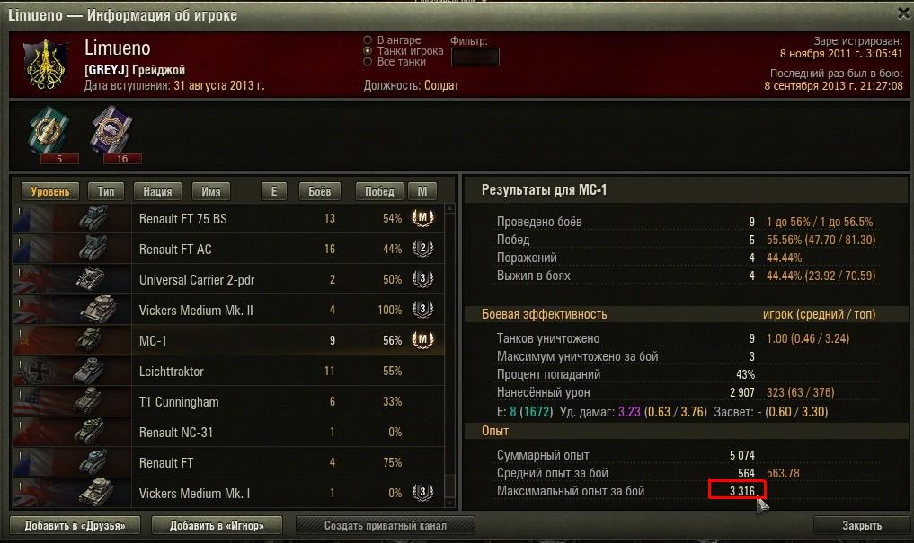 Max34_Volgogradec Опубликовано: 8 сентября, 2013 Игроки 1 348 публикаций 43 285 боёв Автор Жалоба Поделиться Опубликовано: 8 сентября, 2013 08 Сен 2013 - 21:00 пользователь AJIELLIA_OJIEHuH сказал:Я так понимаю что результаты с вотреплайс взяты не из подробной статистики?Берем самый первый результат. МС-1: 2211/3316(Limueno)А в статистике: http://cdn-frm-eu.wargaming.net/wot/ru/uploads/monthly_09_2013/post-7842347-0-08776400-1378663175_thumb.jpgТак что планка по мс-1 все же ниже вроде?"Подробный отчет" в вотреплейс из-за обилия акций довольно часто показывает неверные цифры. Прежде всего я ориентируюсь на "Командный результат", где у Limueno именно 2211 опыта без према, т.е. с премом это 3316, что, кстати, указано в его статистике по МС-1 2 Ссылка на комментарий Поделиться на других сайтах Другие способы поделиться...