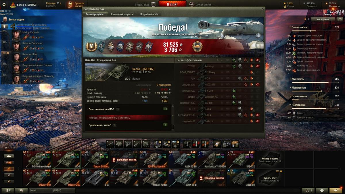 Sanok_S Опубликовано: 29 мая, 2017 Игроки 9 576 публикаций 33 973 боя Поделиться Опубликовано: 29 мая, 2017 утра всем комрады, ну вот очередная рабочая неделя.Чет у нас вообще все пропали, Пахеич как там дитеныш? Нормально все, кушает и отдыхает? Стас, что с тех. поддержкой, Камень смотрю ооооооооочень давно не появлялся в иге и не факт что появится, думаю он забил на это дело + наверняка не в курсе какие полномочия на него возложили, из-за того что ты вышел из клана и передал права не тому человеку велика вероятность, что клан может быть потерян Илимко, ты как-то странно на форум заходишь, то тебя очень много, то нет вообще, стихийный ты наш Гранд финал прошел, Нави слили Торнадо в 1/4, даже до финала не дошли, затем торнадо энерджи взяли 1его место и стали чемпионами мира. Все игры не смотрел, только некоторые видел. Попробовал вчера немножко пофармить на премах, наполучал люлей, но таки немножко пофармил, потратил все деньги на оборудование пока была скидка, восстановил оборудование везде где хотел, в том числе и на некоторых танках, которые в будущем будут только для снятия х3 и х5. Серебра нету, расходники подходят к концу, на склад осталось примерно на 2кк расходников, немножко шоко, колы, чего-то ещё и больших ремок, все остальное покончалось нафег. На днях походу будет новый патч и эти самые новые рейтинговые бои среди 10 лвл, где брать серебро не знаю даже Как бы это печально не звучало, но ни мутц ни пилот не фармят так как хотелось бы ибо с 10ками вообще почти ничего не могут, а какие 10ки сейчас сами знаете, они даже прем пульками в борт не всегда пробиваются, печаль одним словом, остается только старушка яга 8,8, которая является льготным премом, попробовал на ней, не просто конечно, но таки фармит. Было бы нормально если бы на кармане было примерно 10кк, но даже 1кк нет, Санок стал бомжом и гоняет не очень принятные мысли по поводу продажи некоторых танков до 9 уровня включительно, но пытаюсь с собой бороться. Можно было бы избавиться от проходных танков аля чех 7 лвл, проходные ЛТ-9 аля т54обл, т49 и амх 1390 + пройти и продать китайченка 8 лвл вз 132, но там еще катать и катать на всем и много катать, а катать фактически не на что, баблишко конечно во всех этих танках есть, мож даже и 10ки покупать не буду сейчас, а когда-нибудь потом когда разбогатею и то не факт, жесть какая-то, не могу со своим ангаром совладать, многое хочется, но ничего не получается, все упирается в серебро Ссылка на комментарий
