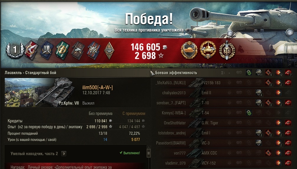 Sanok_S Опубликовано: 12 октября, 2017 Игроки 9 576 публикаций 33 973 боя Жалоба Поделиться Опубликовано: 12 октября, 2017 (изменено) нормально Стас пофармил Тапко-лев конечно жесткий танк, по броне зараза жесткий, не всегда в НЛД берется, не всегда в маску, не всегда с бочину когда ромбит, интерес оный танк вызывает, но я не успеваю вообще все выкачивать блин. У меня там сейчас в ближайших планах фарм серы, лямов до 4, там бы и 2-е метки взять на рево и пелотке, на пелотке кстати мастера так и нет, докачка т54обл, ее реализация, затем выкупи т100лт, китайченок топовый 8 лвл ждет своего часа стоит, юдес топовый аналогично стоит и мастера нет. Посмотрим, мож в ближайшее время продолжу.з.ю. акция на 1,5кккк серы разошлась на половину за 4 дня, выходит за 3 выходных доедят ну и мне надо где-то 290 бонов на 2-е оборудование будет дофармить после получения награды, вроде завтра обещаются раздать, там же будет 1к голды, 7 дней према и резервы на серебро, который ой как нужны и который отлично фармятся именно в РБ. Изменено 12 октября, 2017 пользователем Sanok_S Ссылка на комментарий Поделиться на других сайтах Другие способы поделиться...